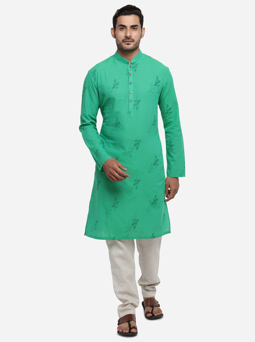 Let your style do the talking for you when you step out wearing this appealing Green Self Design kurta. This Regular Fit kurta will become your wardrobe favorite, owing to its impeccable features.