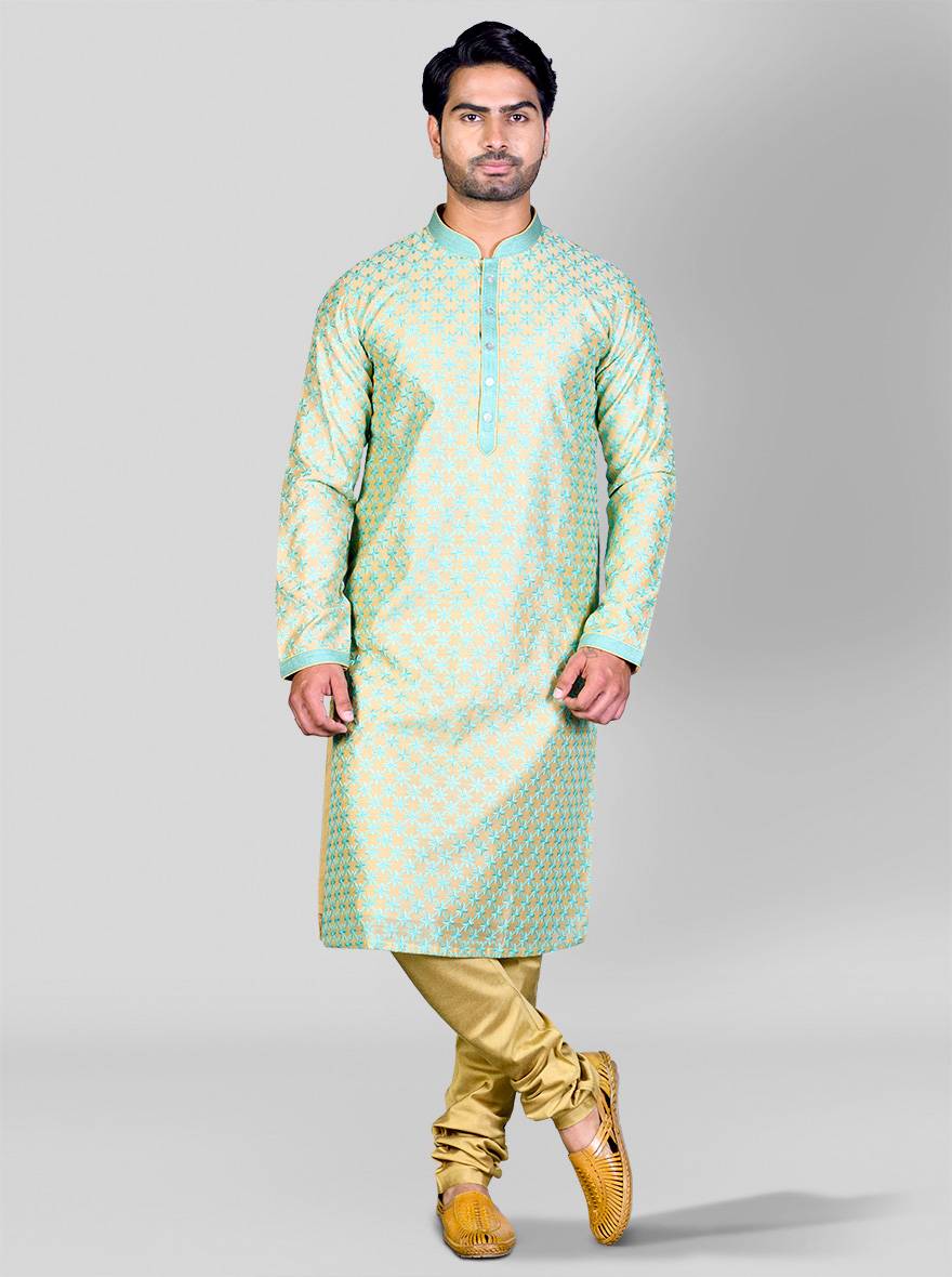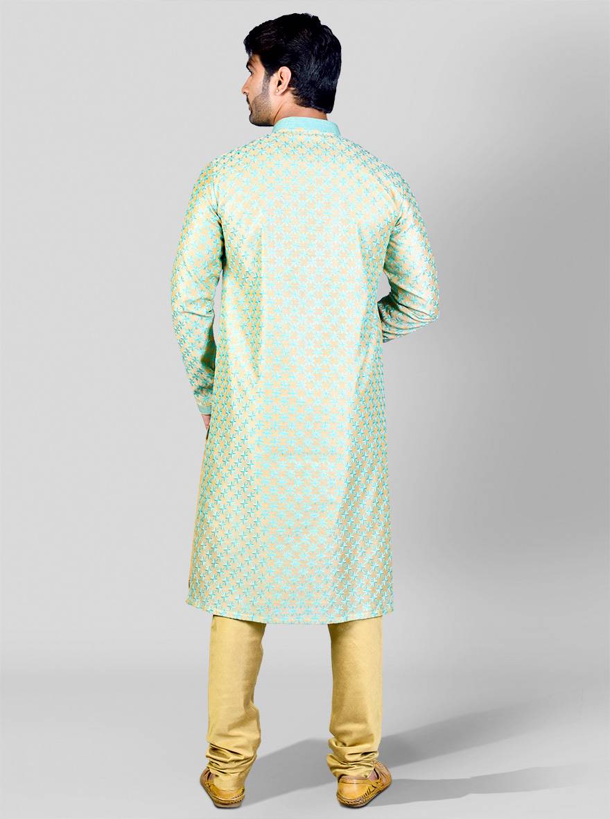 Details: This green kurta set is a great way to dress up in style for any traditional occasion or event. This mens ethnic wear is made from chanderi silk fabric. The attractive embroidery all-over the kurta adds to its overall beauty. The kurta features mandarin collar, front button placket and long sleeves, which gives it a meaningful touch. The regular fit kurta comes along with golden colour churidar.