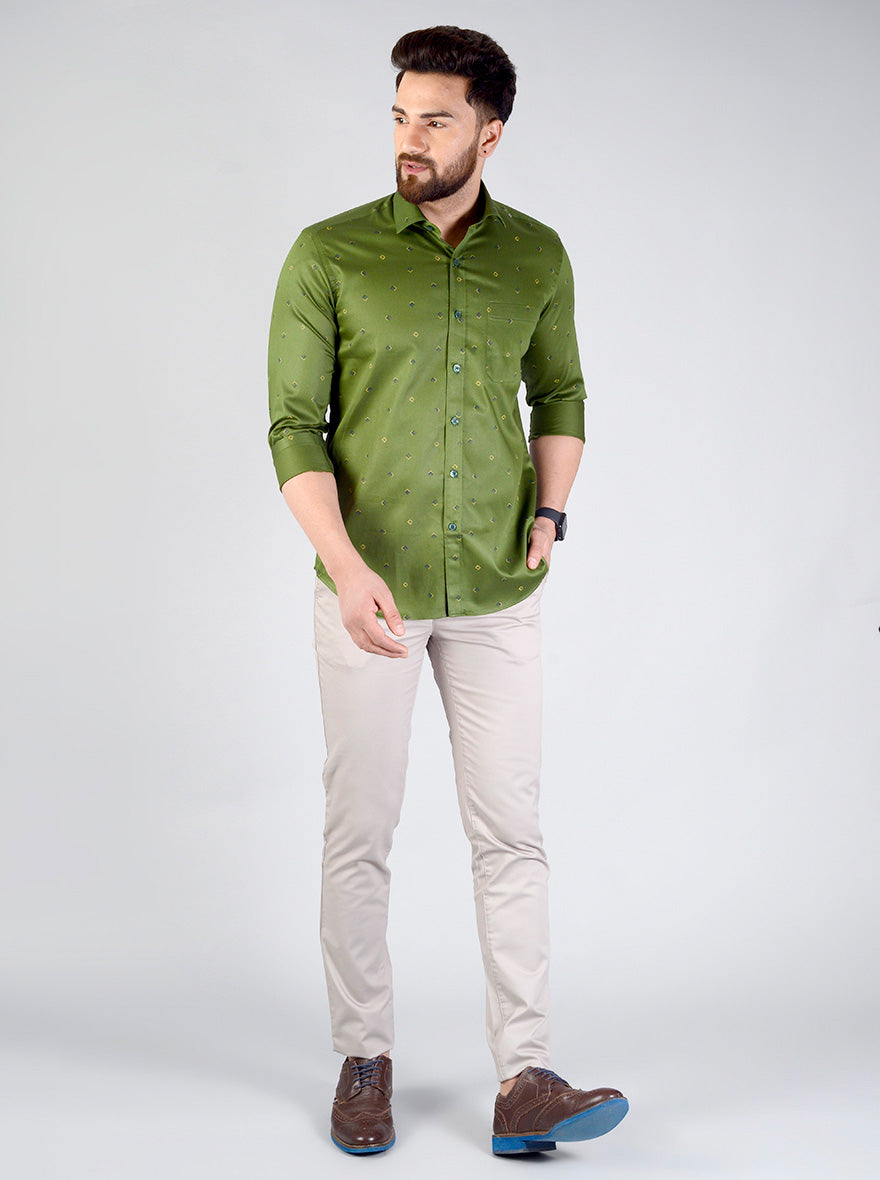 Details: This green printed formal shirt will elevate your style quotient in a distinct way. This slim fit cotton shirt features chest pocket, front buttons closure and shirt collar. It will keep you comfy from AM to PM.