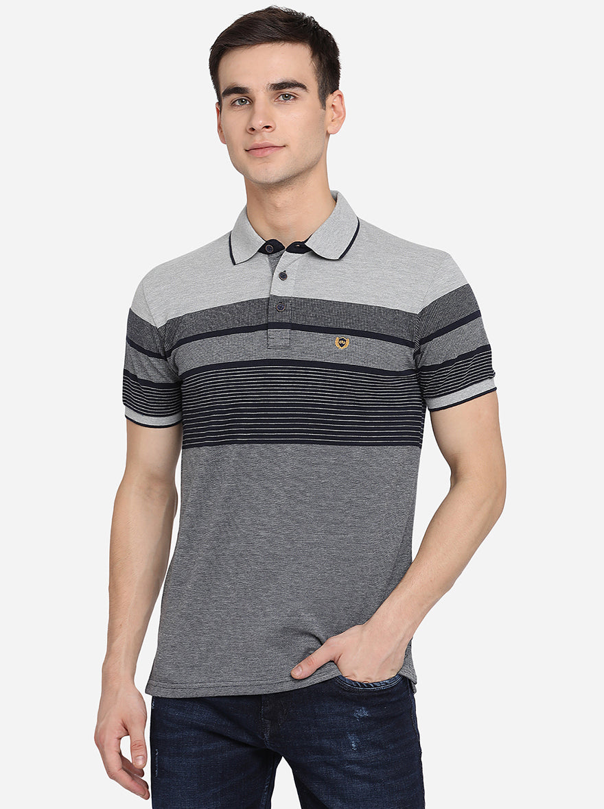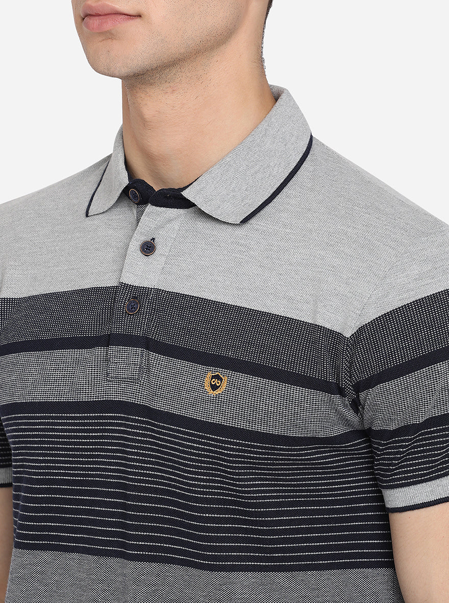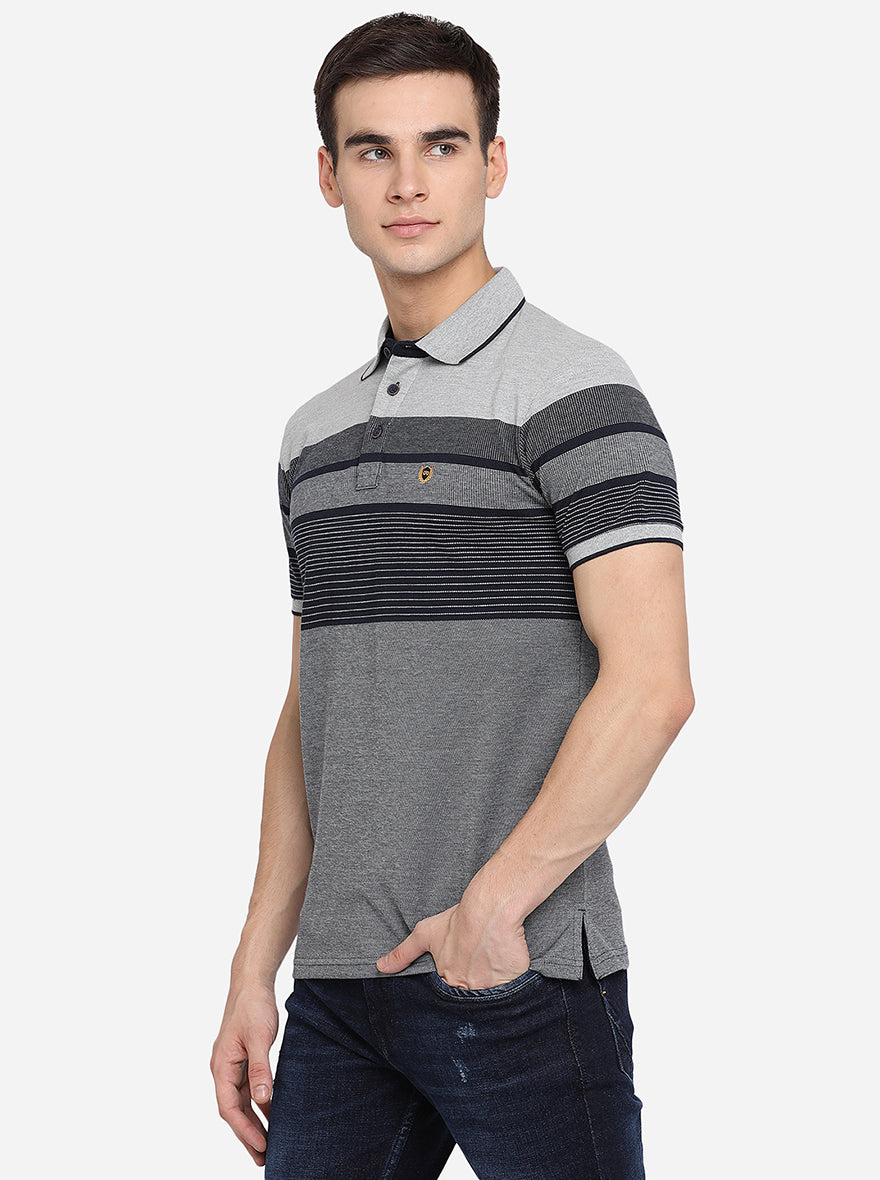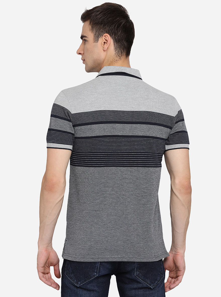 Grey Striped Slim Fit Polo T-Shirt | JadeBlue