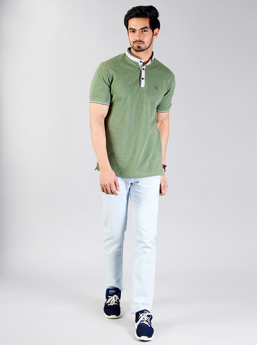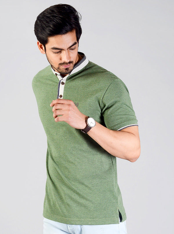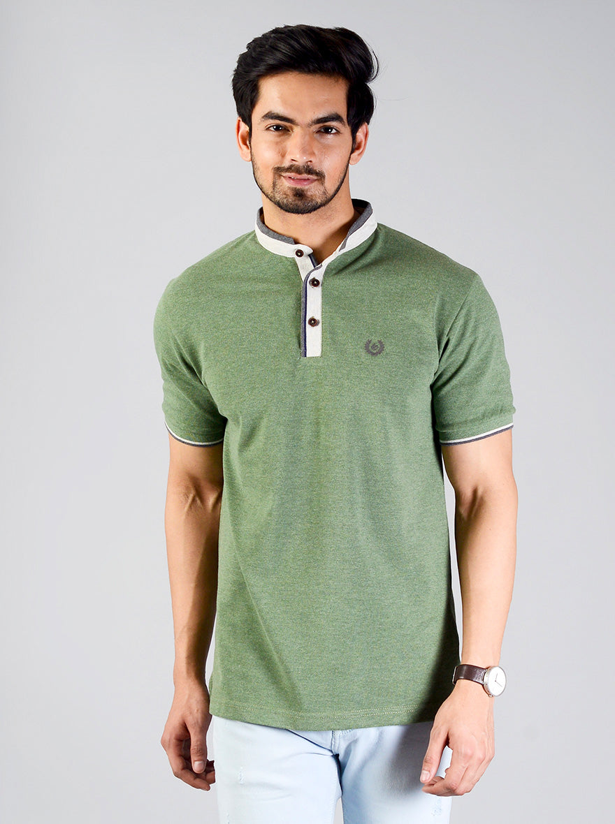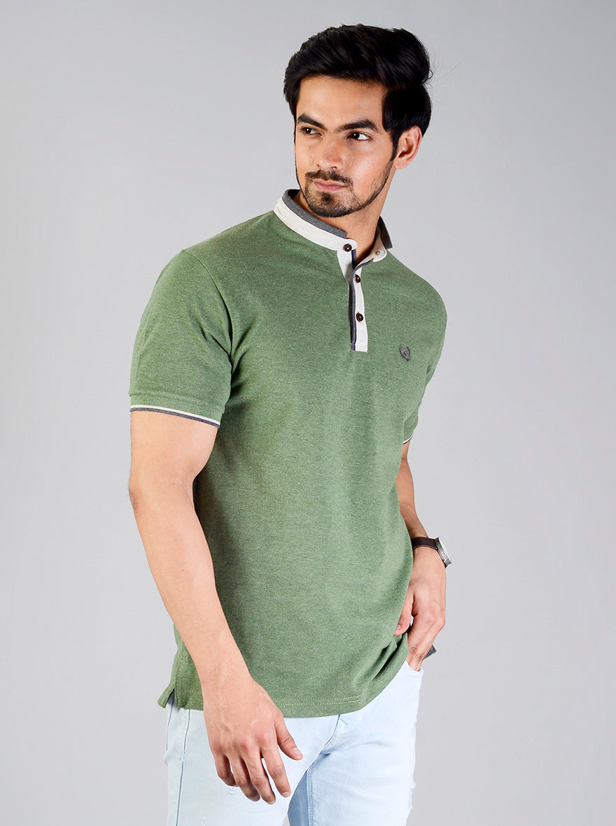 Details: This trendy green T-shirt from Greenfibre will do all the talking for you. Made from cotton blend fabric, this slim fit tee features mandarin collar, half sleeves and short side slits.
