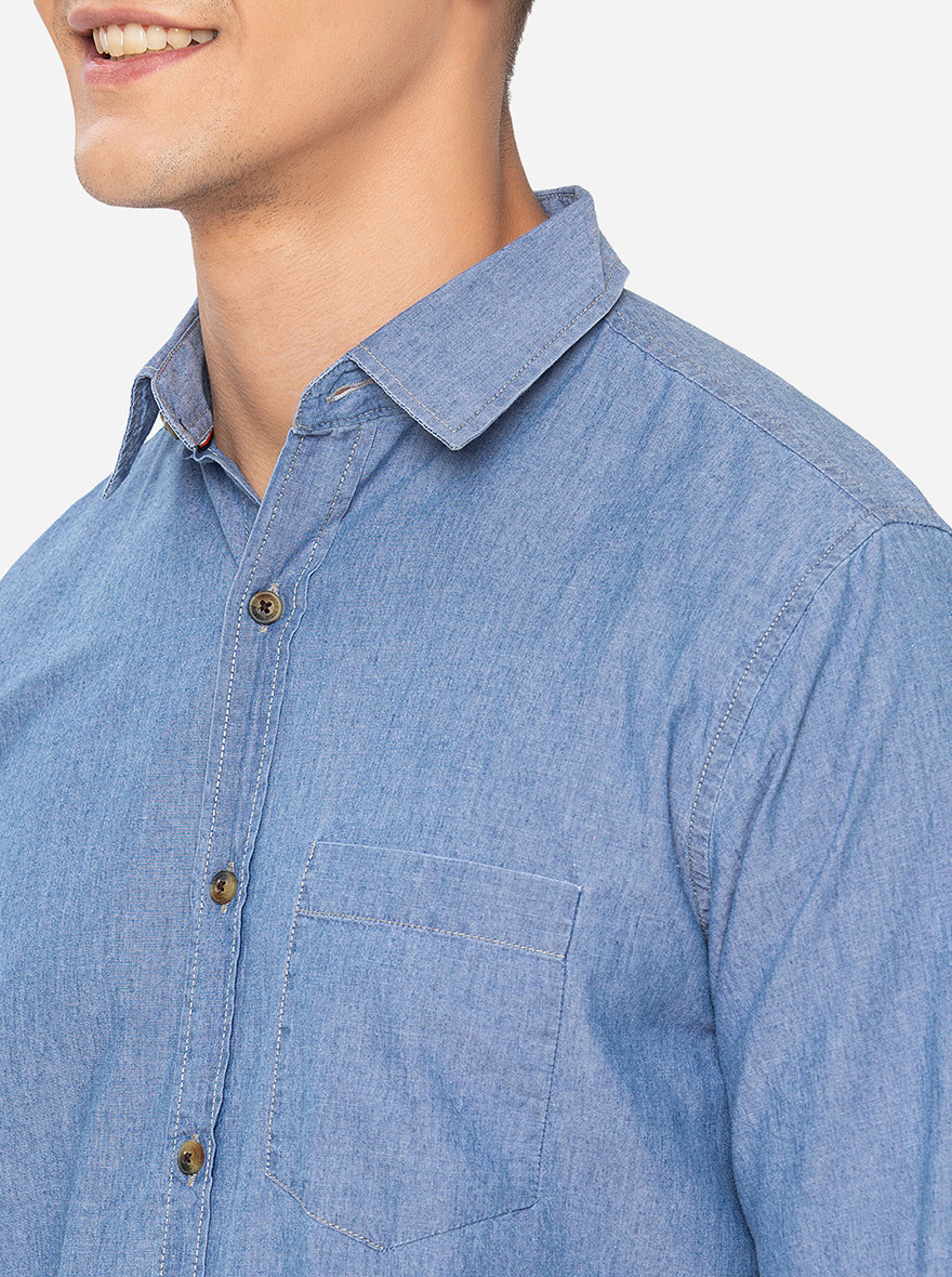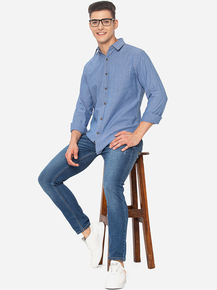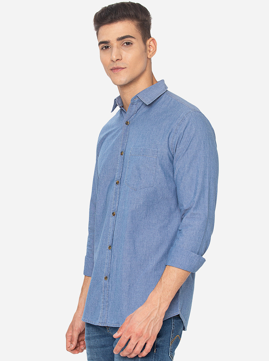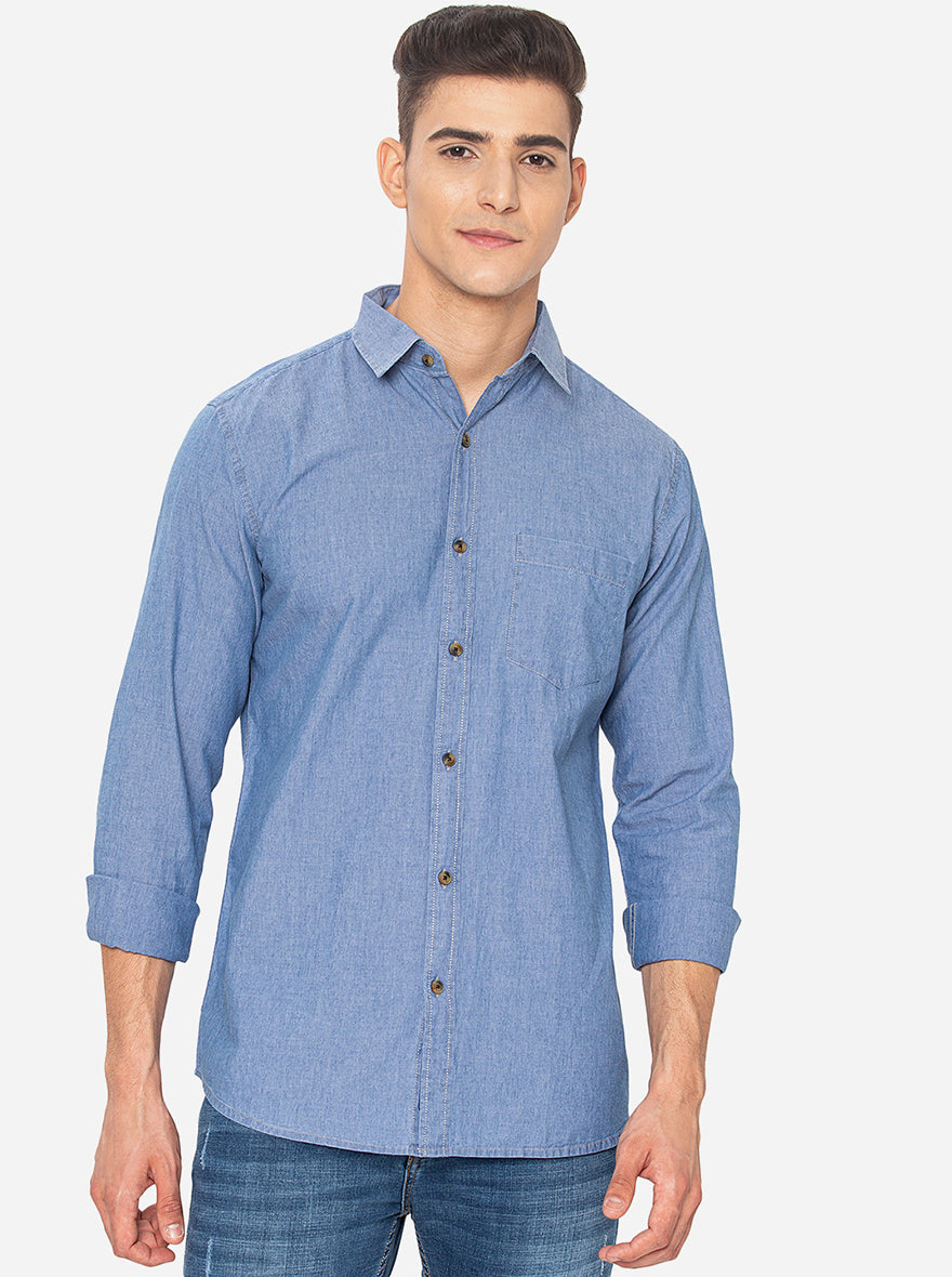 Details: Wear this attractive solid indigo blue semi casual shirt designed by JadeBlue. Made to perfection from breathable cotton fabric, this slim fit shirt is what you require to achieve a stunning look all through the day. It is styled with features like spread collar, front buttons placket, full sleeves, buttoned cuffs, chest pocket and curved hem, which lends it a functional touch. This casual shirt can be paired with black jeans, suede loafers and watch to achieve a fashion-forward look in a snap. Invest in this must-have casual wear now!