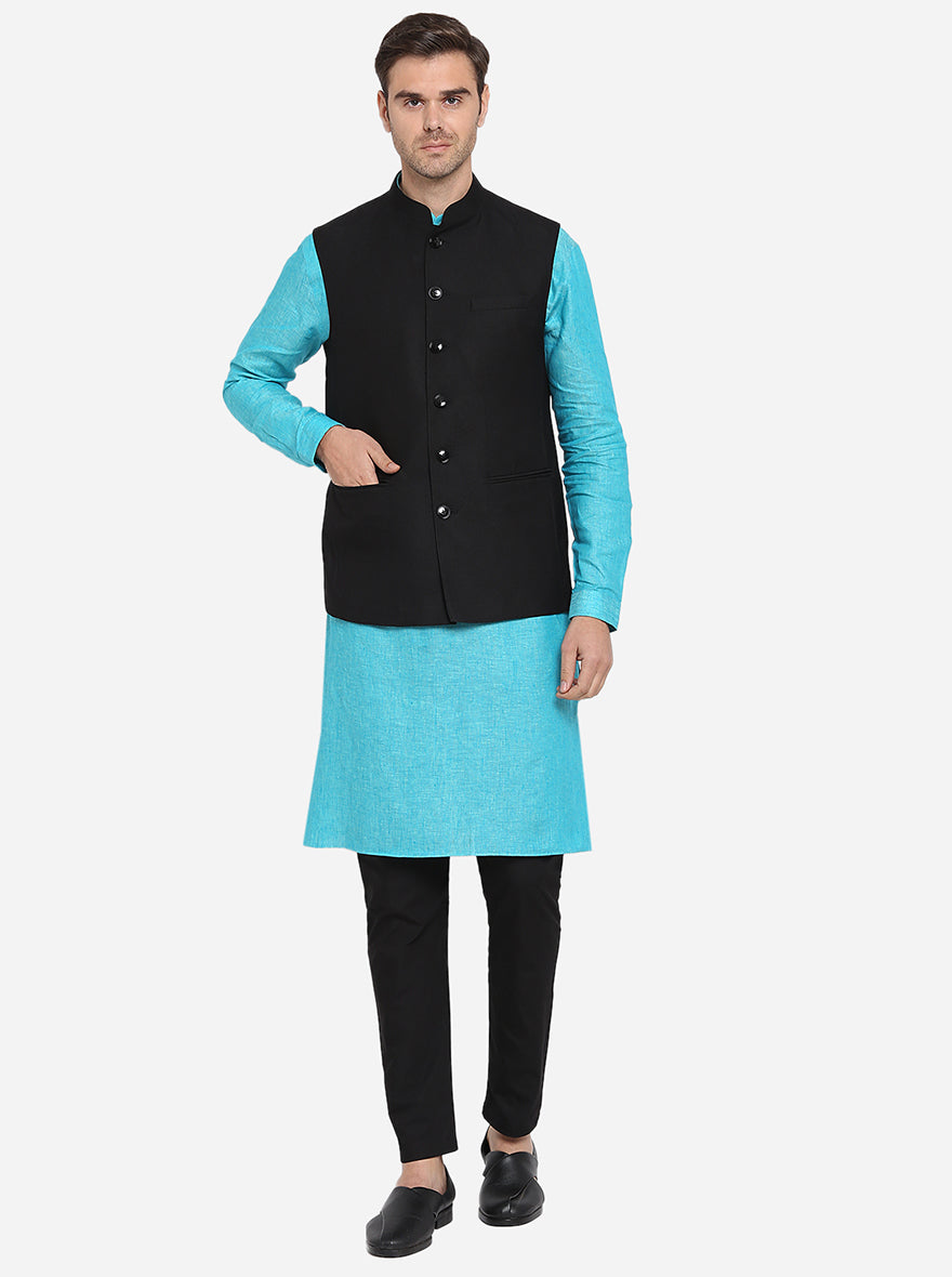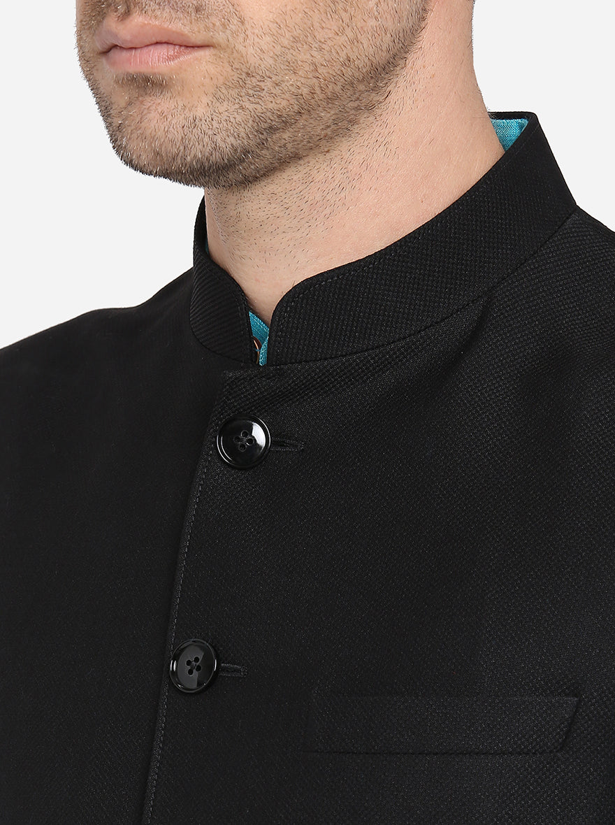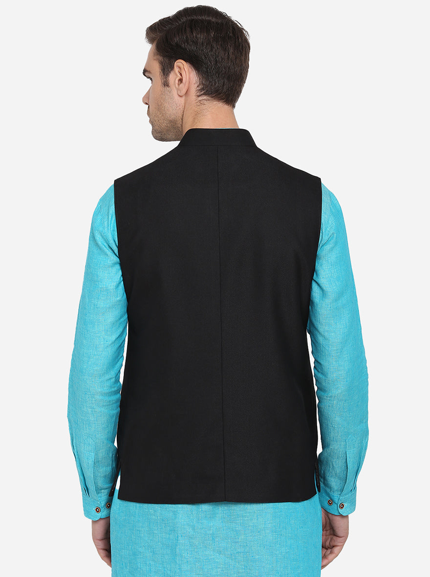 Details: Minimalistic yet charming is this Black jacket from the brand Modi Jacket. Featuring a mandarin collar neck along with a front button closure and is sleeveless. Comes with three inseam pockets on the front. Adorned with a self-textured pattern, it makes up for a versatile choice. Perfect for formal and semi-formal events. Offers a regular fit. Crafted with good quality terry rayon, it assures a great comfort all day long. Tag it with a contrast traditional kurta and pants to complete the look like a pro.