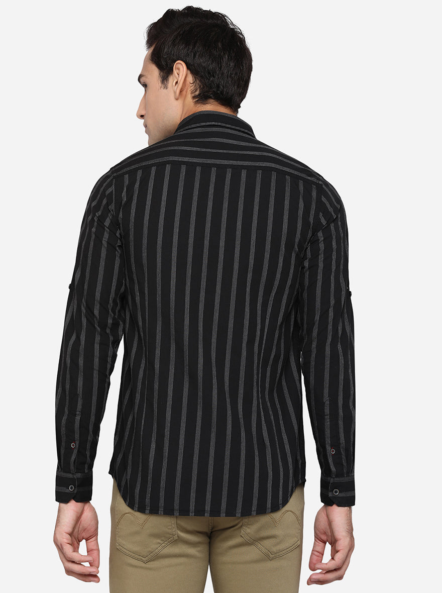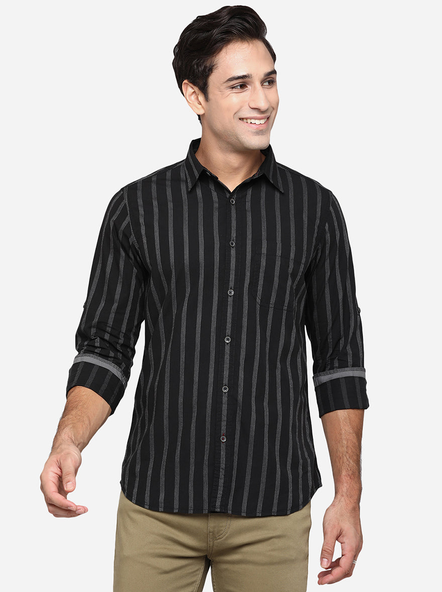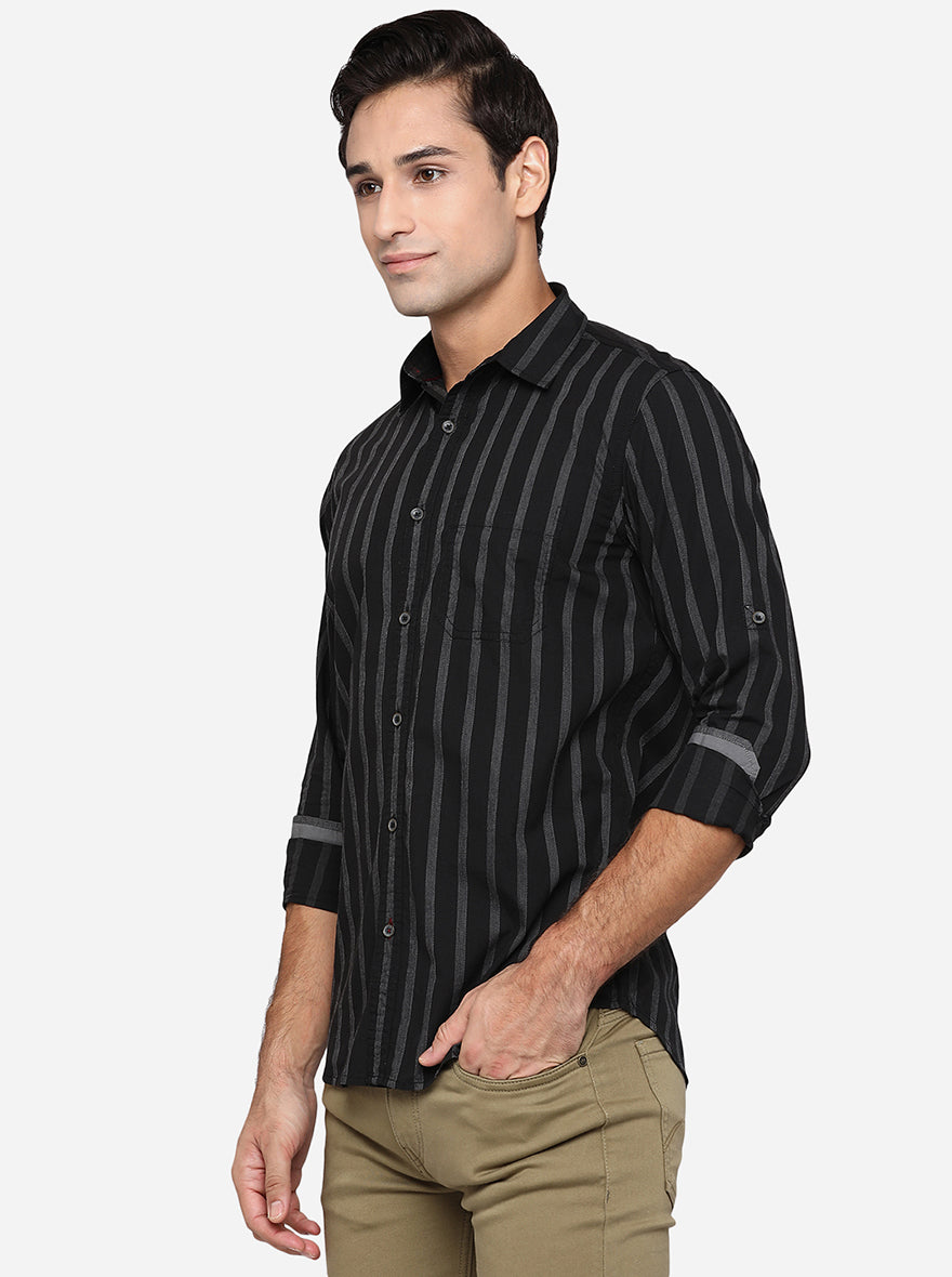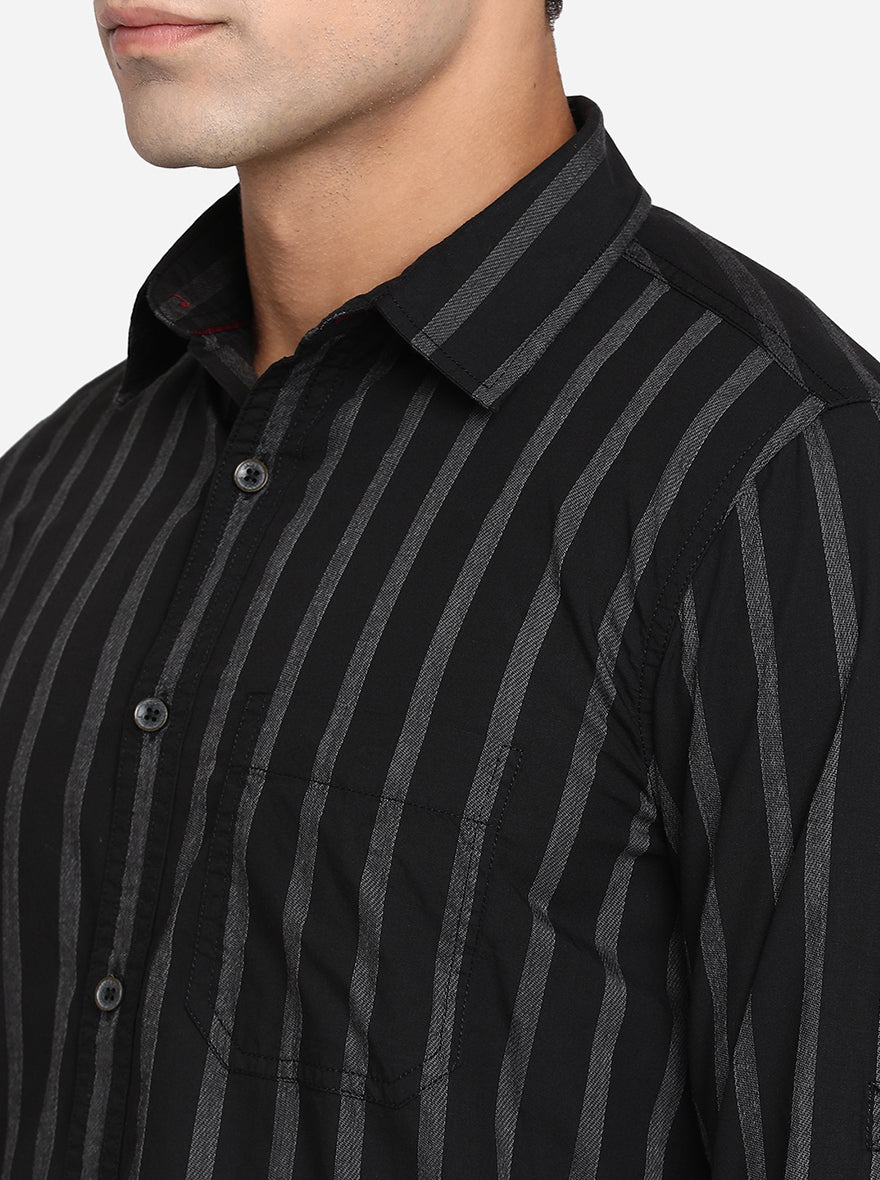 Jet Black Striped Slim Fit Semi Casual Shirt | JadeBlue