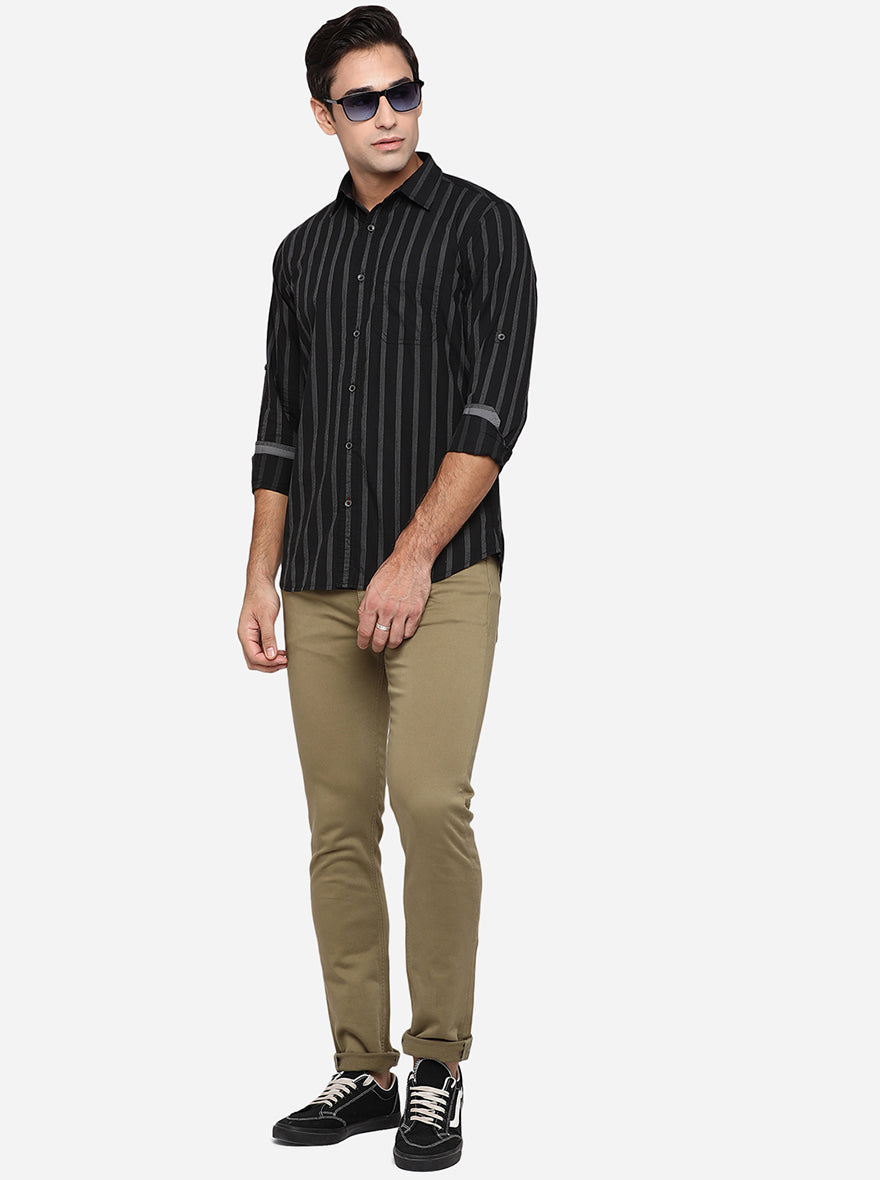 Details: Achieve the look of your dreams wearing this stylish Jet Black Shirt from the latest collection of JadeBlue Sport. It features a shirt collar, full-sleeves, button placket and is tailored to a slim-fit. It is adorned with a striped pattern, making up for a trendy choice. Crafted with rich quality Cotton, it promises you a great comfort and breathability for long hours. Perfect for semi-casual wear. Team it with a Biege pant and a pair of Tan oxford shoes to achieve the desired look.