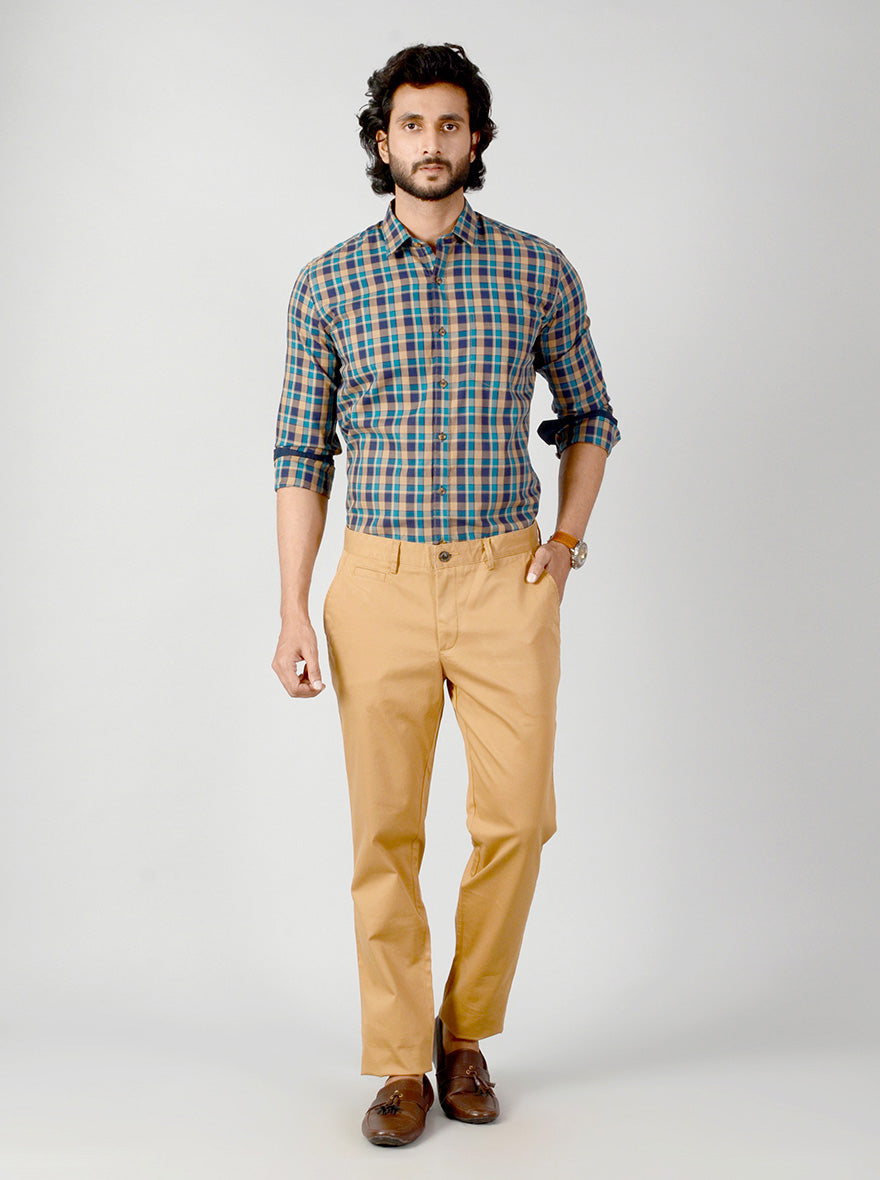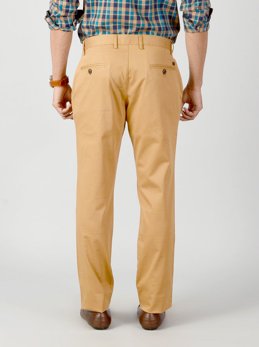 Details: Stay at ease from AM to PM with this khaki self textured trousers. Made from cotton lycra fabric, these slim fit trousers feature belt loops, 4 functional pockets, zip fly and single button closure.