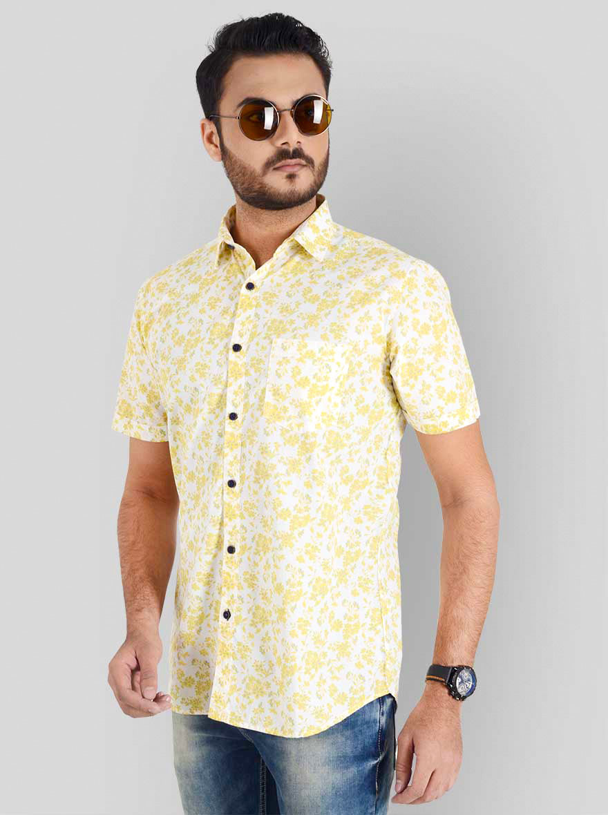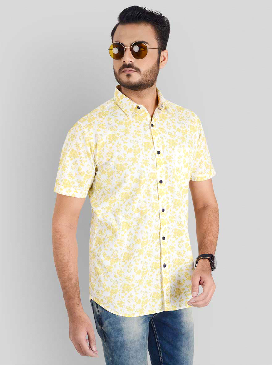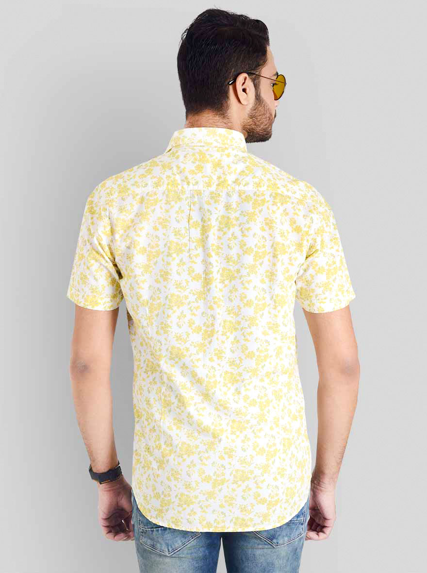 What could be more playful and fresh than this lemon yellow & white printed slim fit casual shirt for men by JB Sport. Featuring the best floral print, this splendid half sleeve shirt is the best pick for those who have an eye on prints. Unique and comfortable, this cotton shirt definitely owes a space in your casual wardrobe.