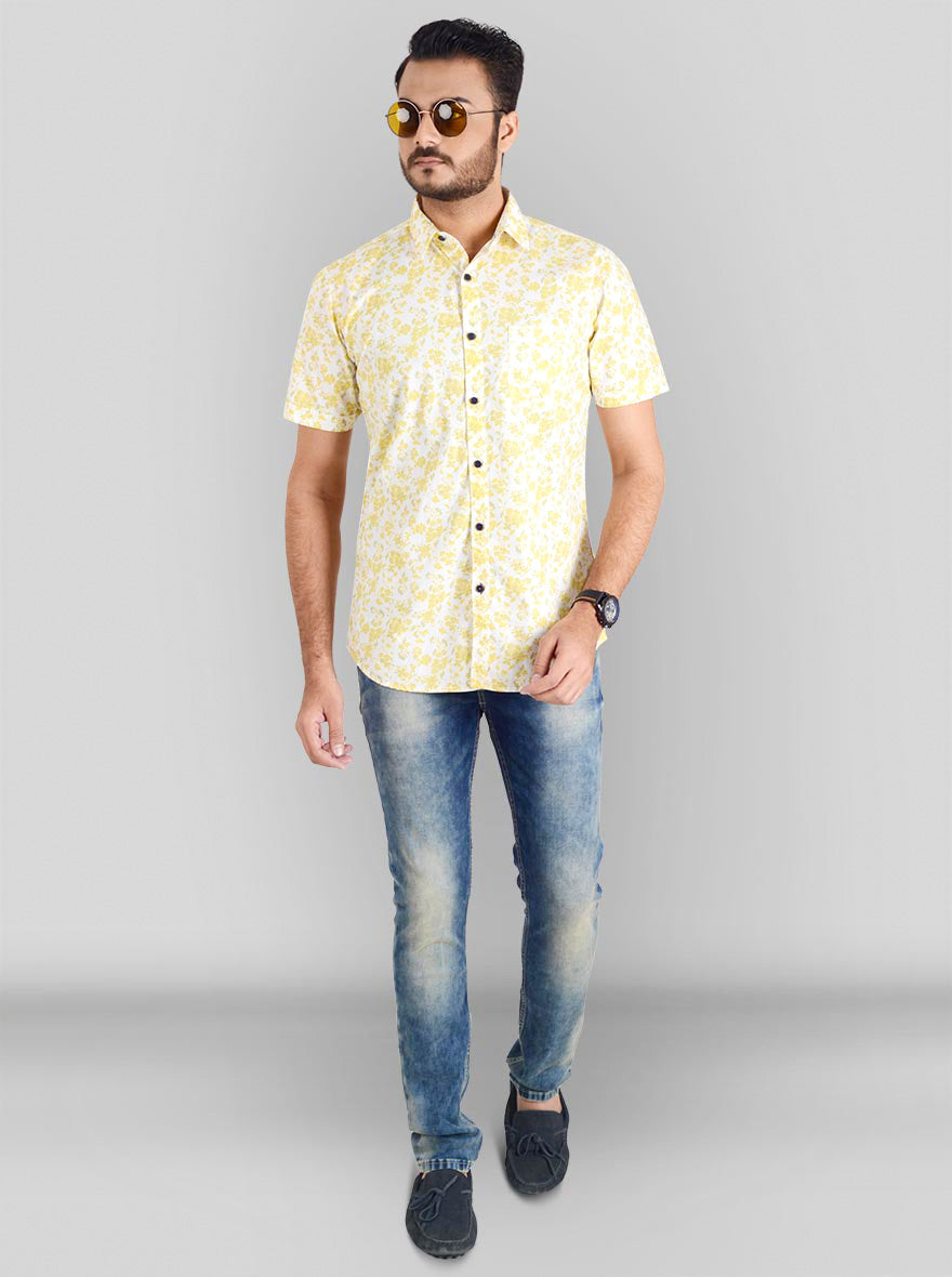Let all eyes fall on you when you wear this lemon yellow and white printed shirt with blue denims and casual shoes. Flaunt your personal fashion style amongst your friends and family. Keep counting the number of compliments you get for this one of a kind look.