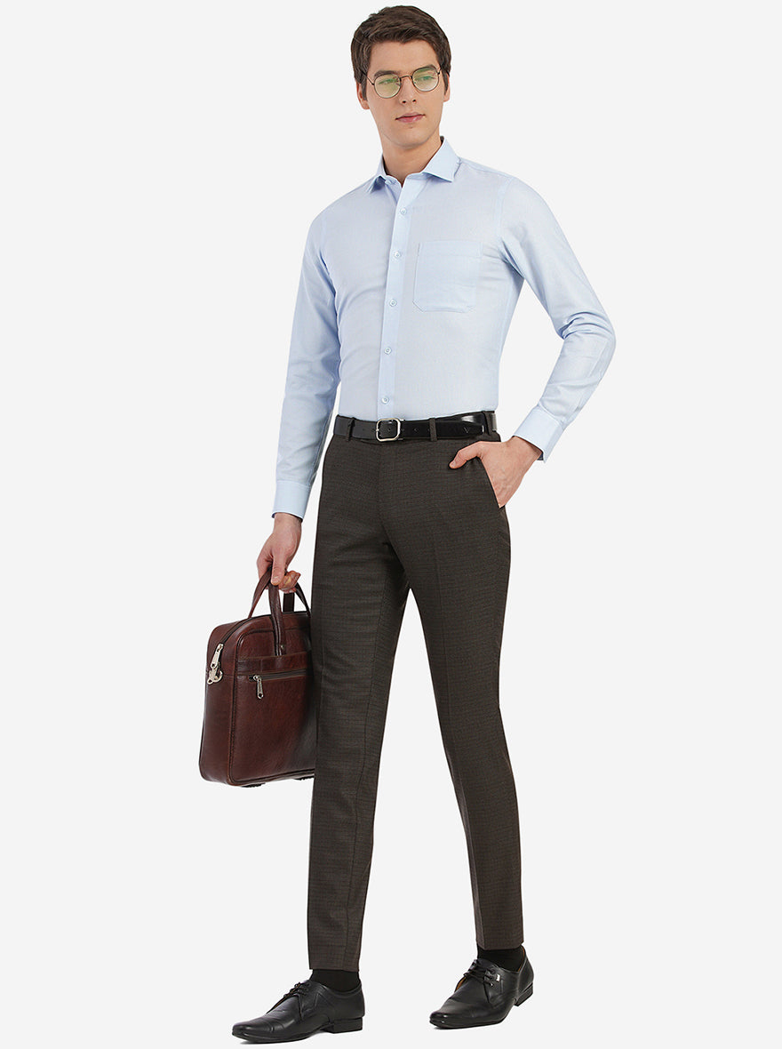 Details: Cast an everlasting impression at your office by sporting this dobby weave light blue formal shirt. This slim fit shirt is made to perfection from light-weight and breathable cotton fabric, which gives you wearing comfort from day to night. This shirt is a wardobe must-have piece and features full sleeves, buttoned cuffs, chest pocket, shirt collar and front long buttons placket. Style this classy shirt with contrast formal trousers, lace-up shoes and belt for a smart yet decent formal look instantly. Own this shirt now.
