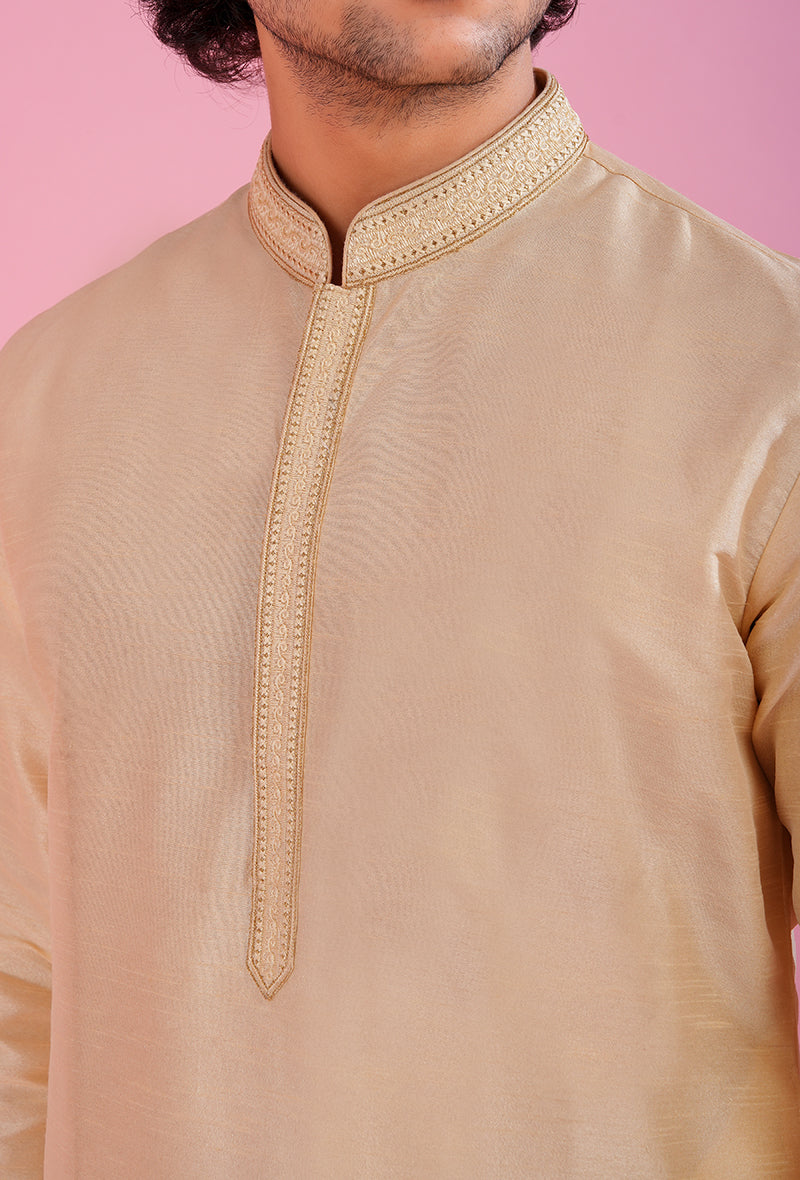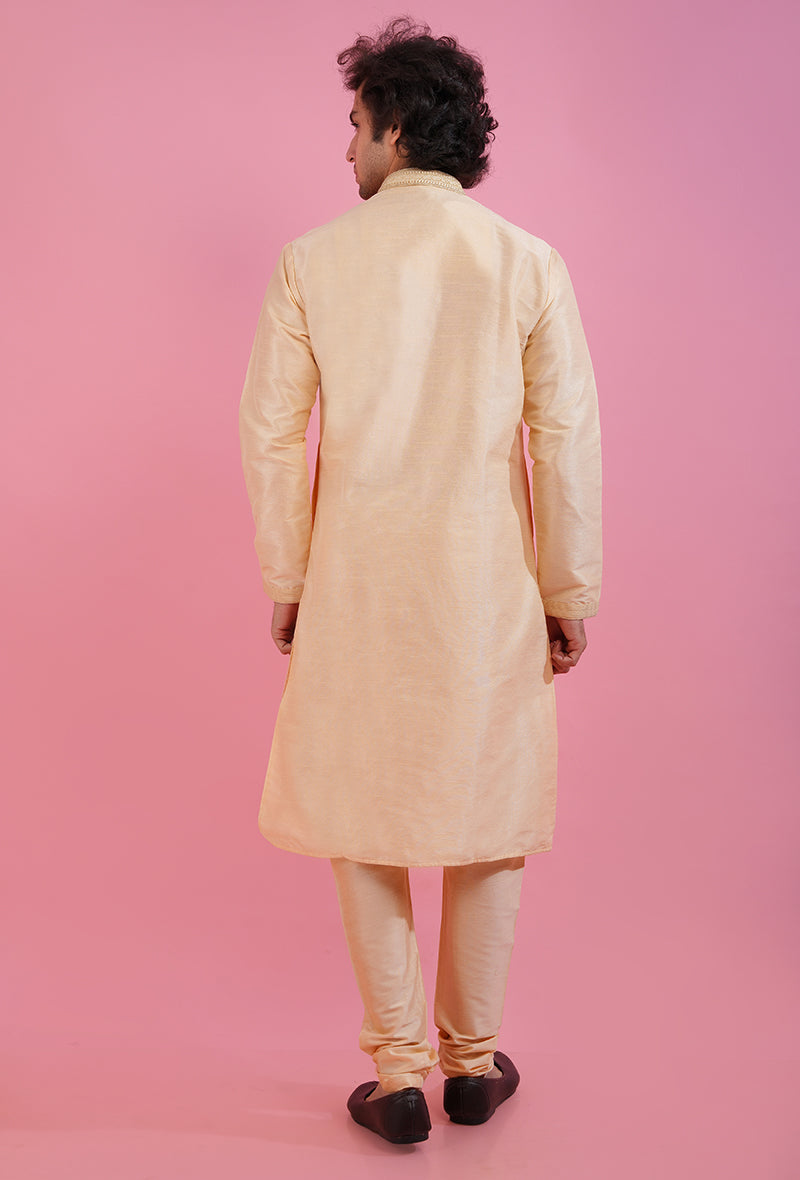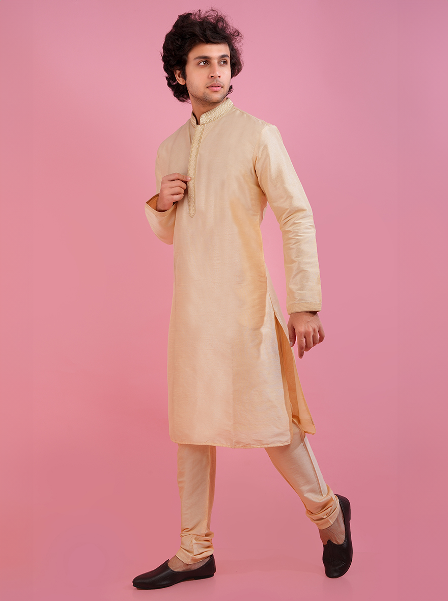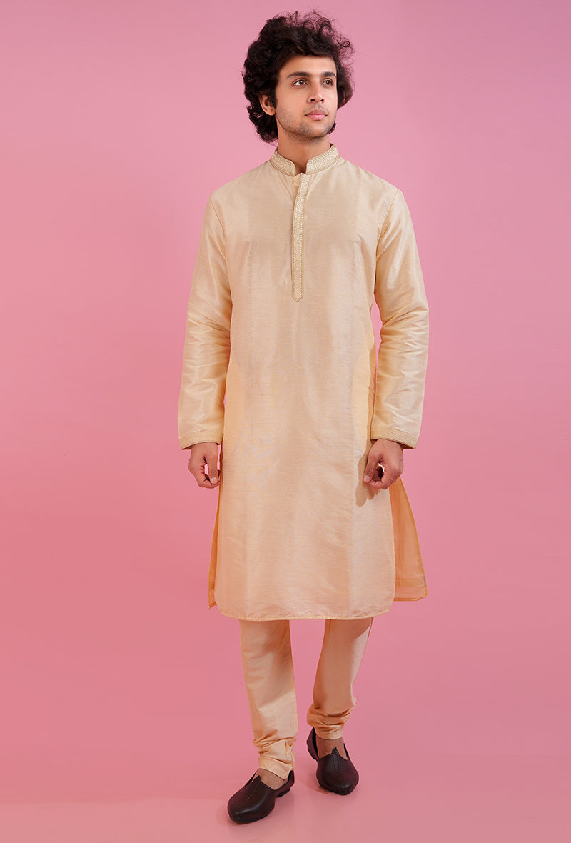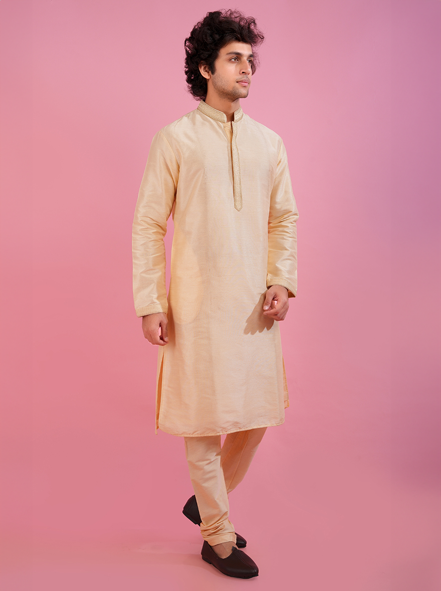 Details: Elevate your ethnic wear with Azania's exquisite Kurta Pajama in Light Gold. Designed for the modern man who appreciates traditional style, this ensemble exudes sophistication and grace. The Kurta features a Regular Fit silhouette crafted from a luxurious Silk Blend fabric with a self-textured pattern and intricate placement embroidery for an added touch of elegance. The Full Sleeves are adorned with resham work on the stand and placket, created with precision and care. Whether you're attending a festive occasion or a pooja ceremony, this Kurta Pajama is the perfect choice. The Mandrain Collar adds a touch of refinement while ensuring you look your absolute best. With Azania, you can be confident in every step you take, knowing you're dressed in a garment that prioritizes both style and comfort. Upgrade your traditional wardrobe with Azania's Kurta Pajama and make a lasting impression wherever you go.