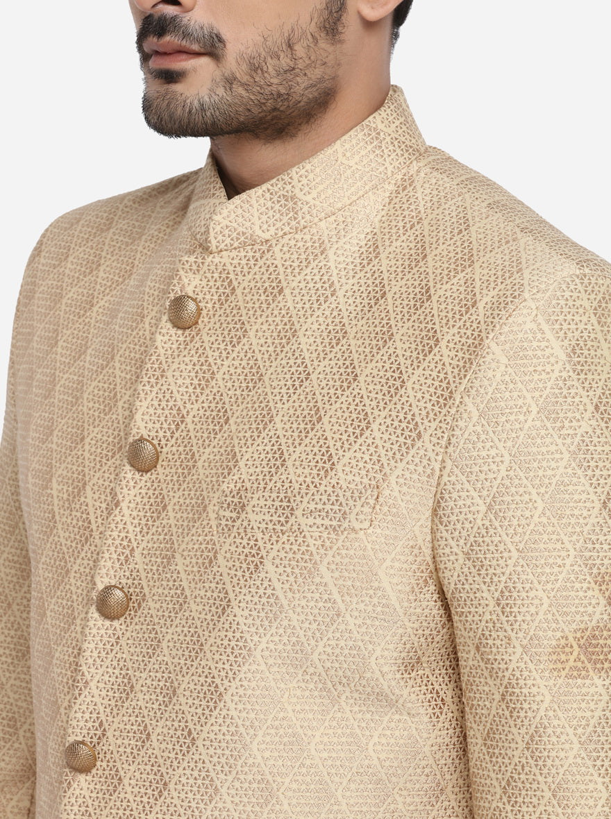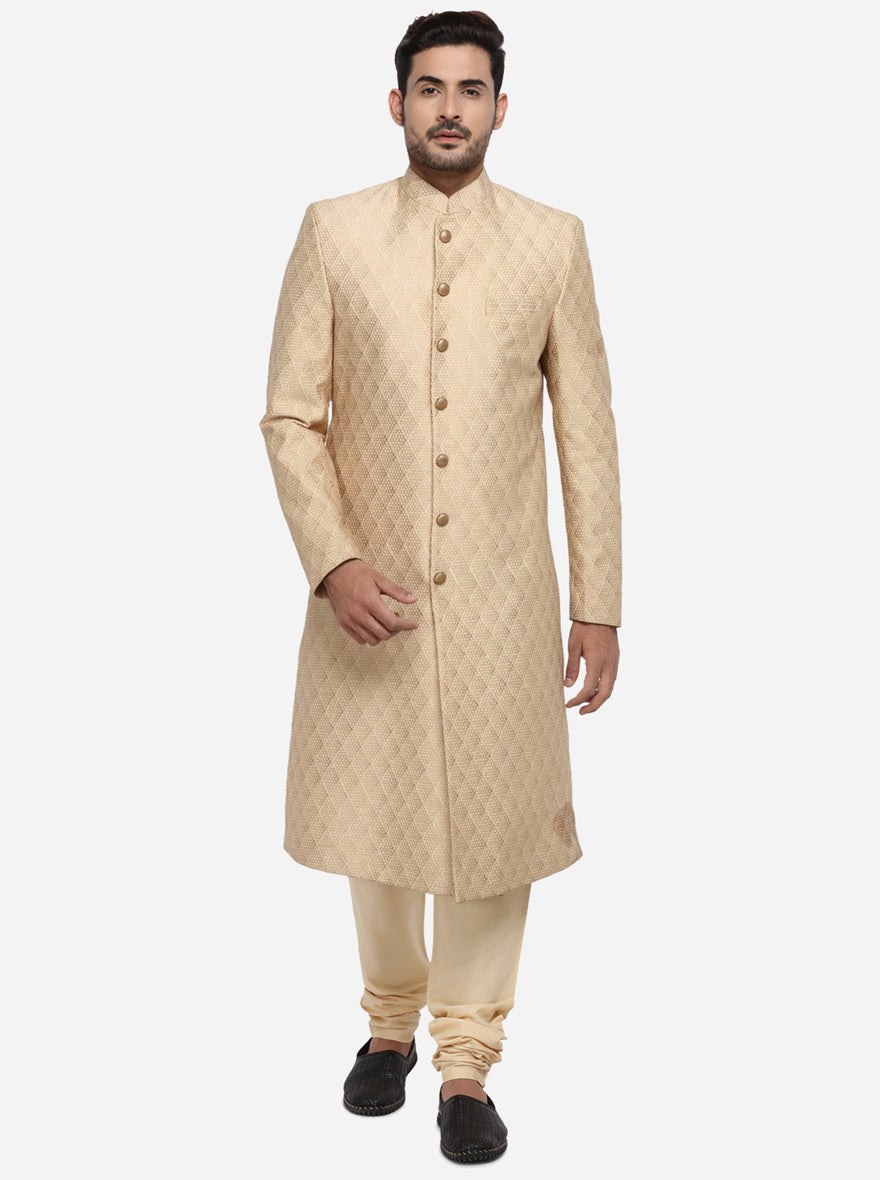 Details: Get admired for your distinct taste in Sherwani by opting for this Self Textured Light Golden men's Sherwani. Crafted using Silk this stunning piece features mandarin collar and side slits. his men's Sherwani by JadeBlue will make heads turn wherever you go. Made from quality Silk Complete the look with a matching bottom wear and your favorite accessory for a sharp look that's sure to impress at any event. Standout from the crowd! Tailored to offer extreme comfort.