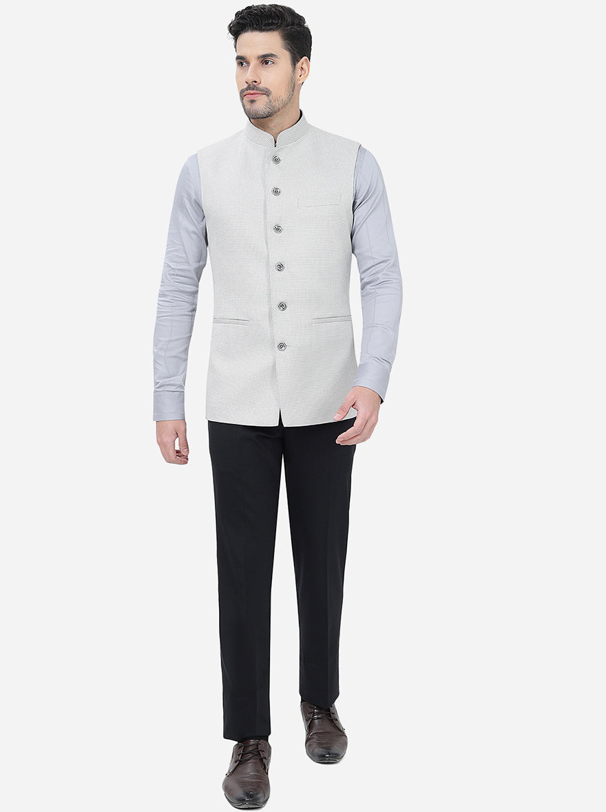 Details: Disseminate your ethnic vibe with this Light Grey Solid Comfort Fit Modi Jacket from latest arrival of JadeBlue Men's Fashion. Crafted with Lightweight, gleaming soft and Durable Terry Wool Fabric for prime comfort and rich feel all along the day. Adorned with Mandrin Collar, Skilled Tailoring, Besom Pocket Cuff and Virtuous Buttons. To team with Grey and Black Slim Fit Formal Dress with Brown Formal Shoes. Authentic for big commarcial meetings, Night Parties and Traditional Events.