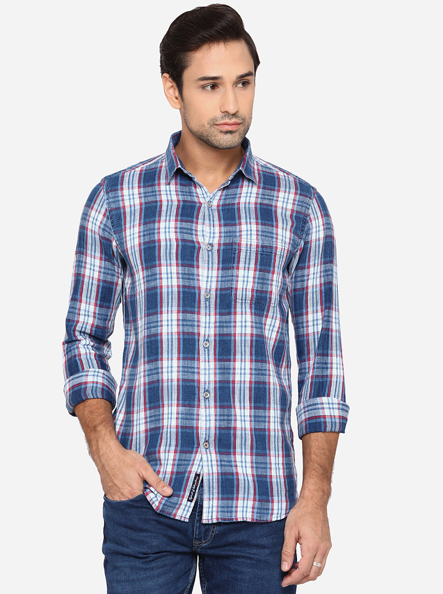 Details: Achieve a dapper look for the weekend getaway wearing this Blue Shirt from the latest collection of JadeBlue Sport. It features a shirt collar, full-sleeves and offers a slim-fit. It is adorned with a checkered pattern, making up for a classy choice. Perfect for semi-casual wear or weekend wear. Crafted with pure cotton, it promises a soft touch against the skin and a comfort like no other. Team it with a well-fitted blue denim and smart sneakers to create a stylish attire.