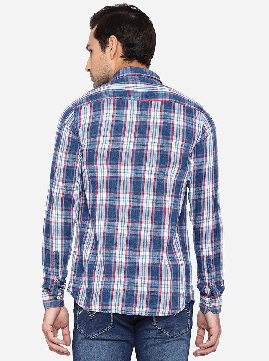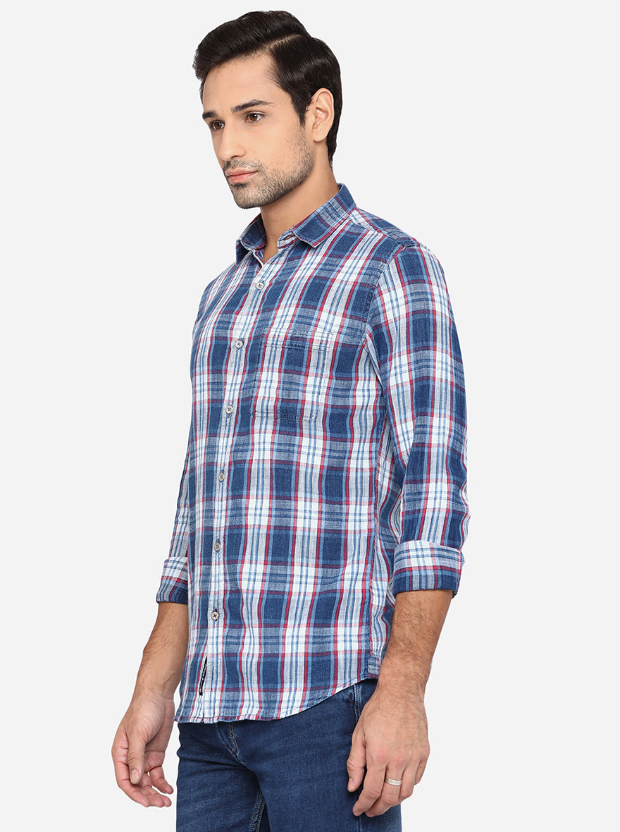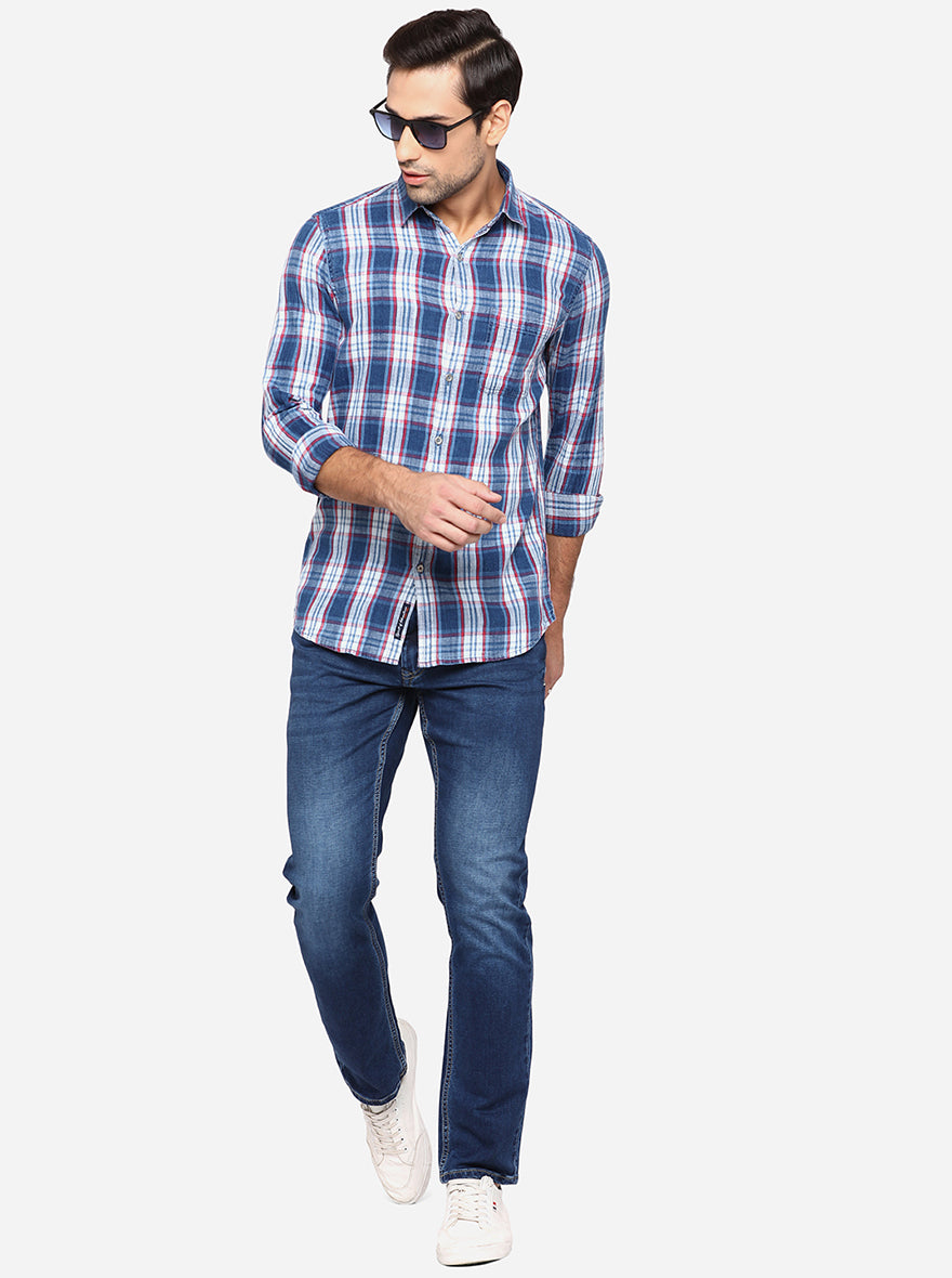 Light Indigo Blue Checked Slim Fit Semi Casual Shirt | JadeBlue