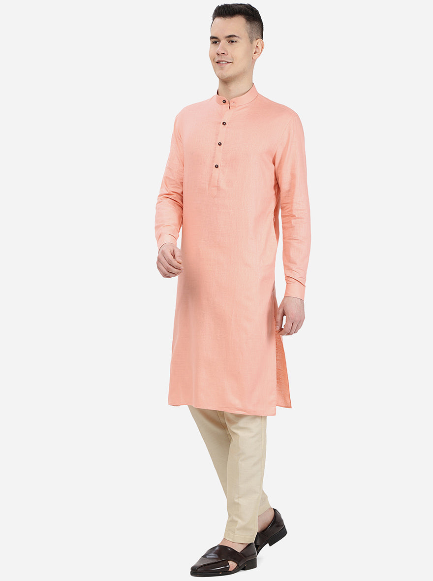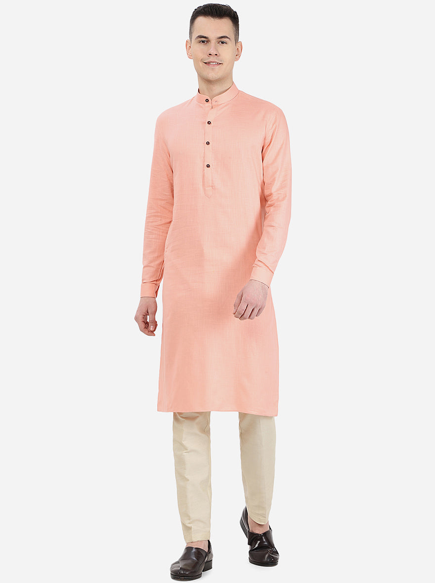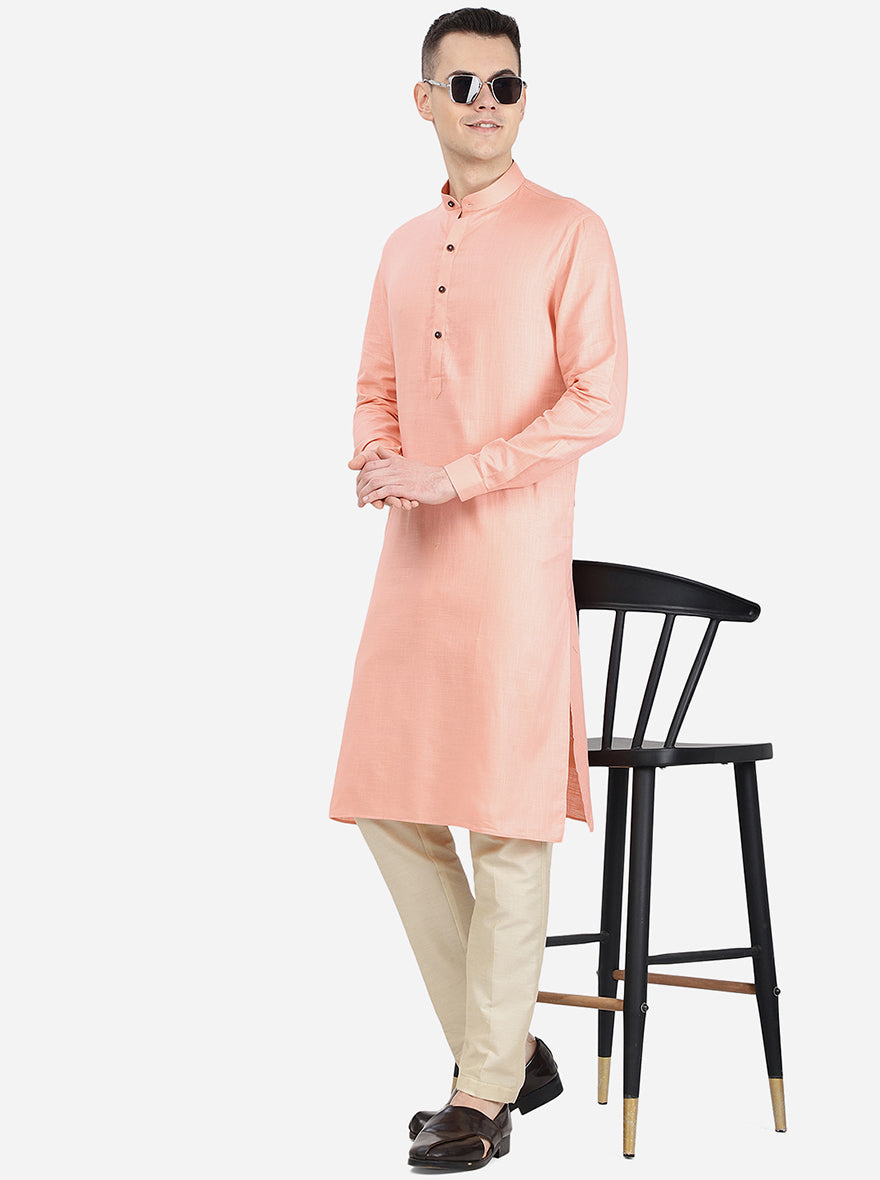 Details: Include some colours of fashion to your ethnic wear collection by adding this self textured light pink modi kurta by Modi Kurta. This ethnic wear is made from good quality of cotton blend fabric, which is great on your skin and offers all day wearing comfort. This stunning kurta features mandarin collar, full sleeves, buttoned cuffs, short front buttons placket, side slits and side pockets, which lends it a functional touch. Wear this regular fit kurta with a white churidar and leather loafers to achieve a stylish ethnic look in a snap. Shop now!