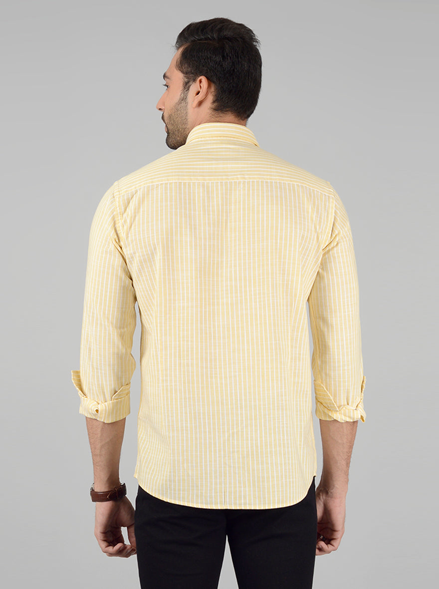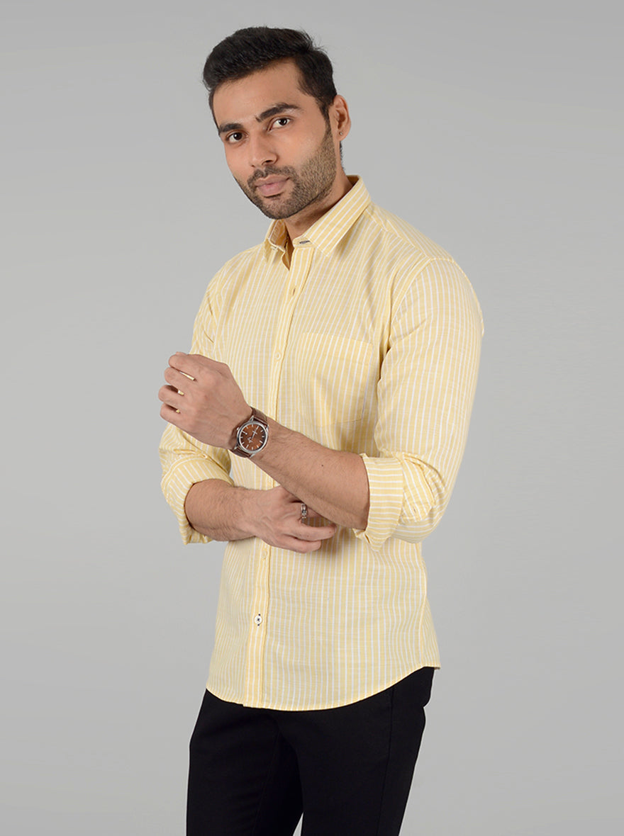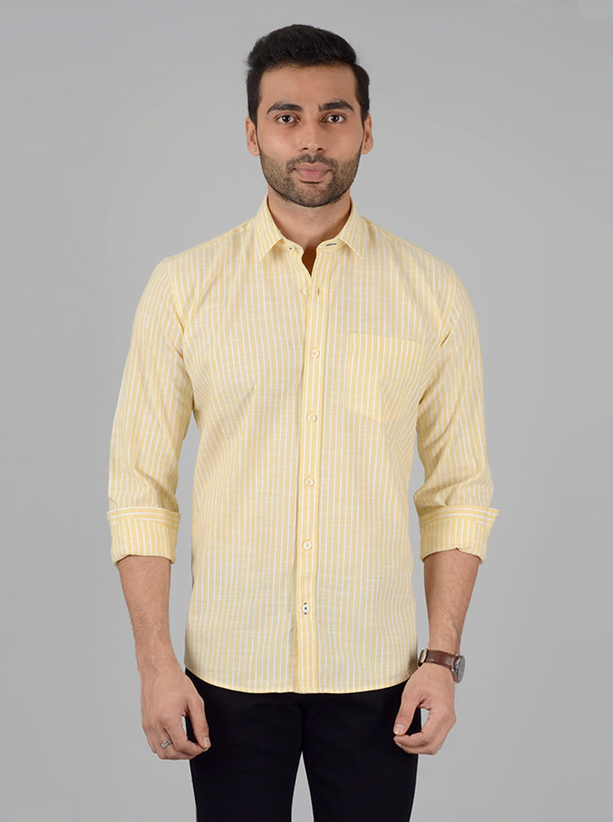Details: Look dapper when you pour yourself into this light yellow striped shirt. This cotton shirt offers great fit and wearing comfort, thanks to its impeccable features. It makes a perfect match with dark blue jeans and sandals.