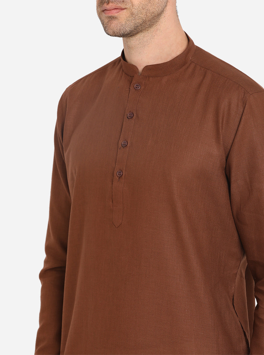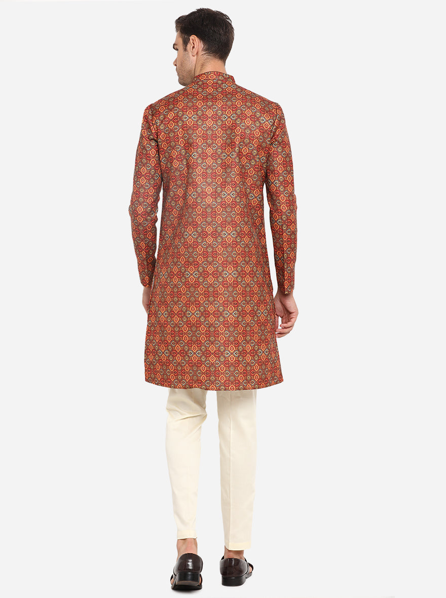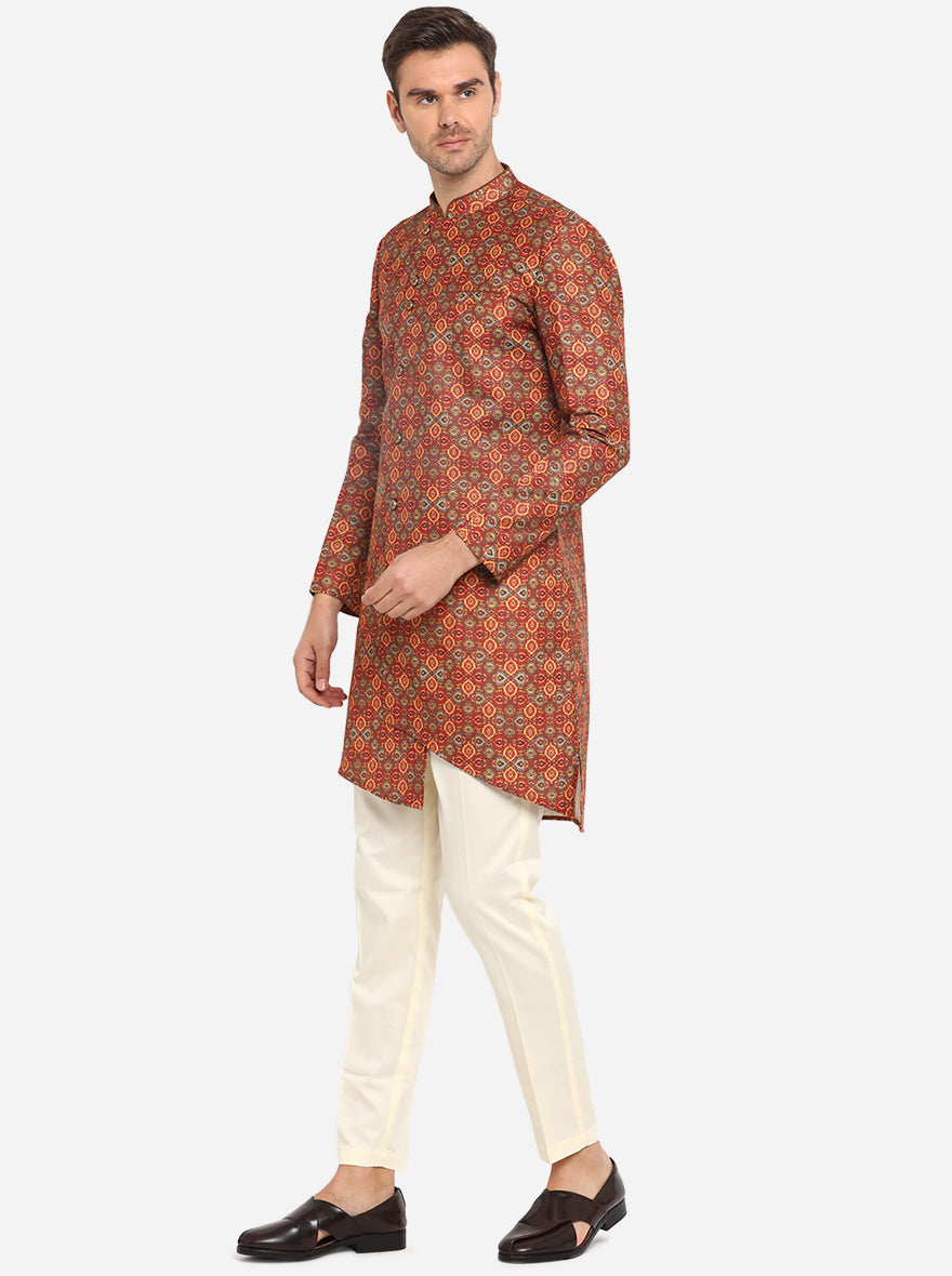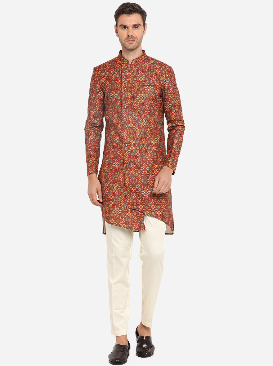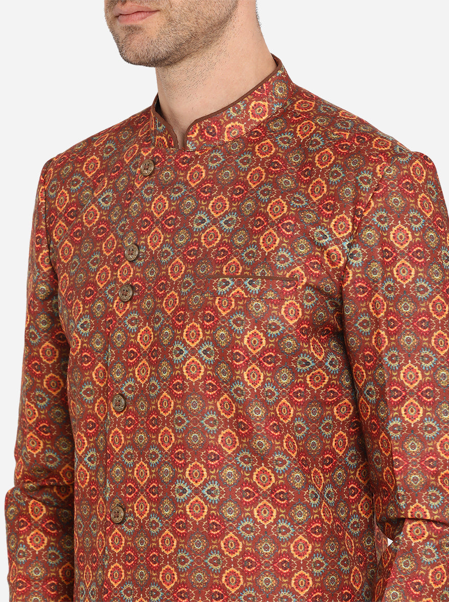 Details: You would fall in love with your outfit wearing this Maroon Printed Semi Indowestern from the brand Azania. It includes a sherwani and churidar. The sherwani features a mandarin collar, full-sleeves, a button placket on the front and offers a regular fit with a knee-length. It has an asymmetric hem. Adorned with a printed pattern, it makes up for a charming choice. Fabricated with good quality Silk Blend, it assures a rich look and a comfort like no other. Complete the look by wearing a pair of matching juttis and you are good to go.