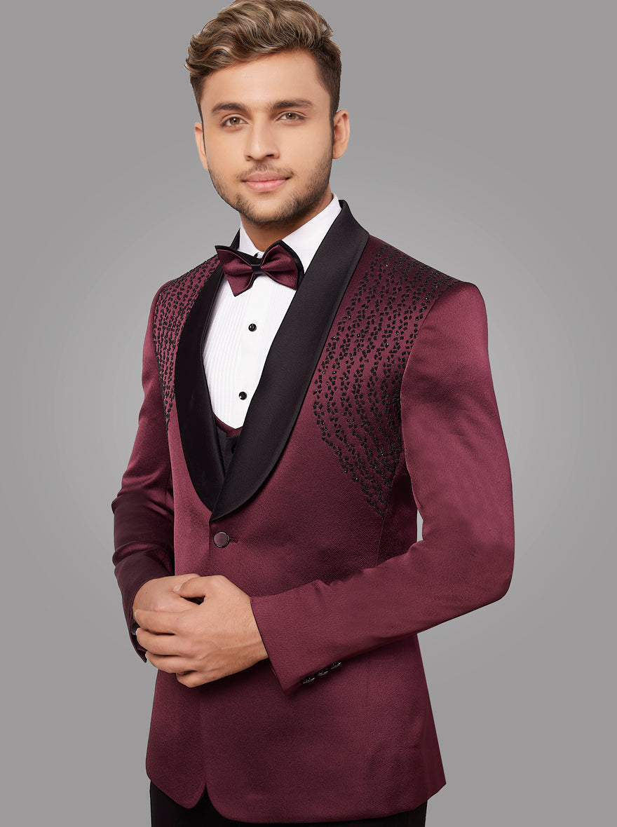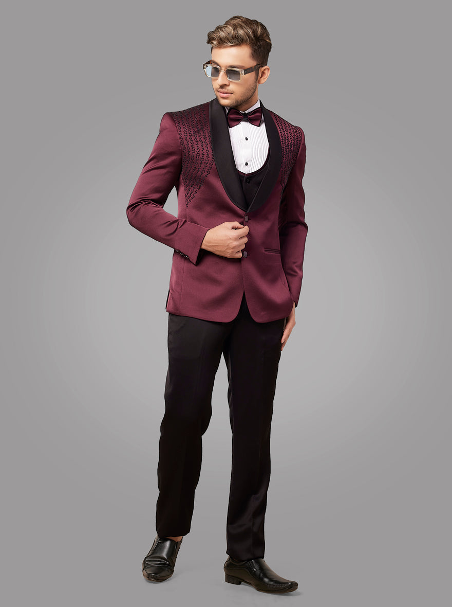 Details: This Maroon Suit is a crafted with perfection to make your occasion memorable, from the latest collection of JadeBlue. Crafted with premium Satin Blend fabric that is soft will provide an elegant look and softness. Featuring one button for closure along with three pockets on blazer and white shirt & vest. Embroidery work on the Blazer. Offers a classic fit for a look with a shawl lapel collar. Perfect for formal dinner party and other occasions.