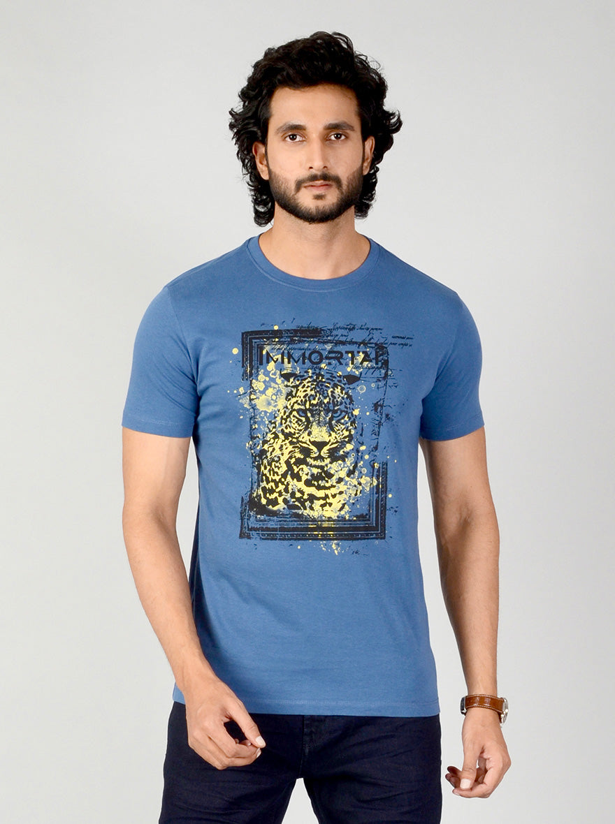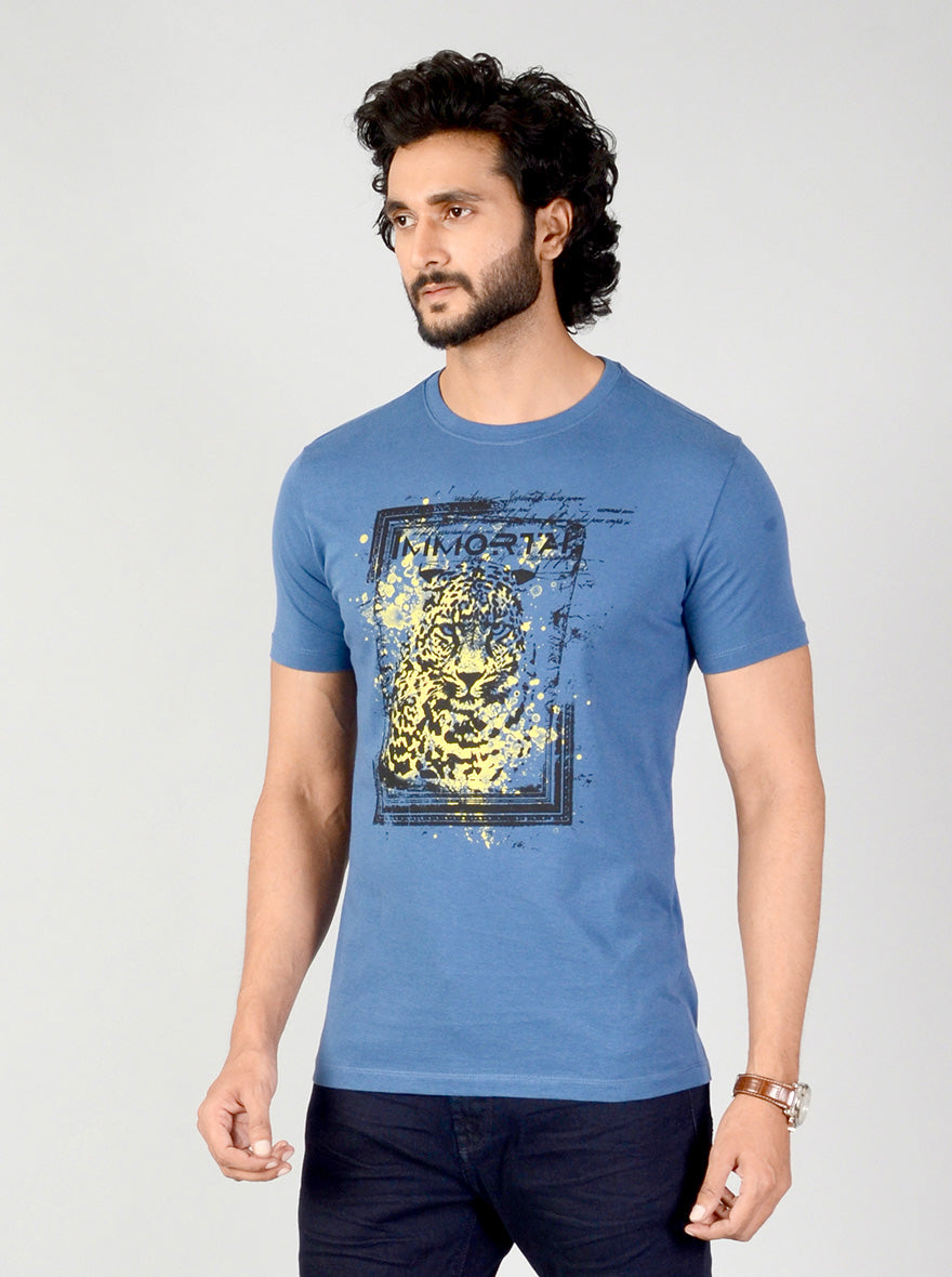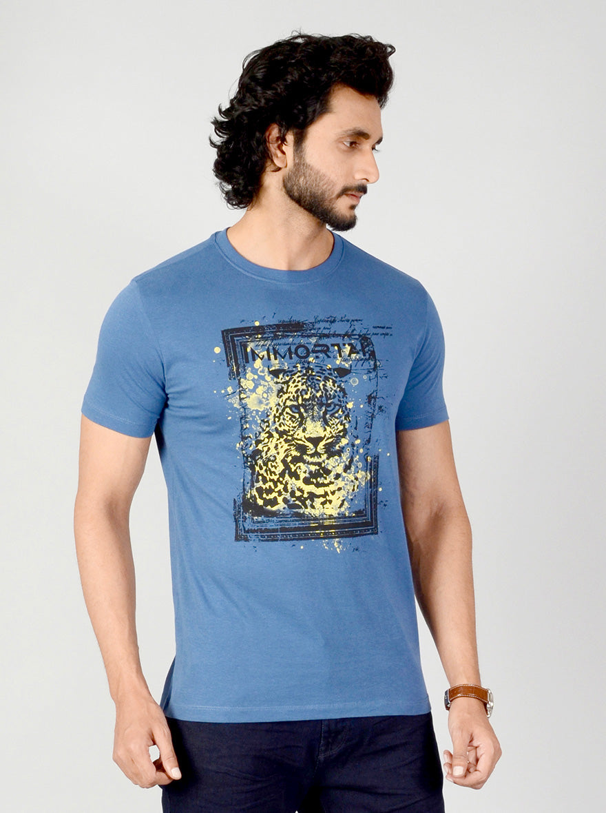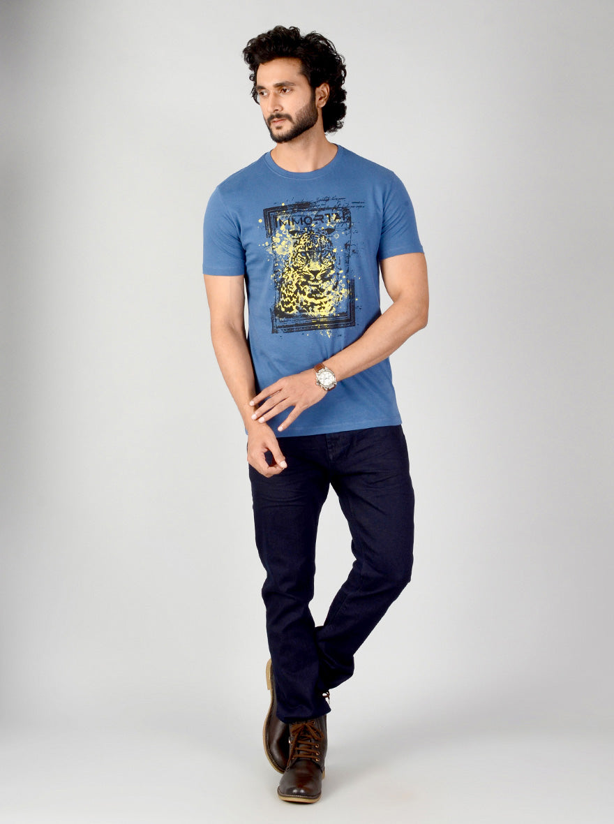 Details: Let your wardrobe get a stylish addition in the form of this cool blue T-shirt. This trendy cotton T-shirt features appealing print in the front, round neck and half sleeves. Must-have piece in your casual tees collection.
