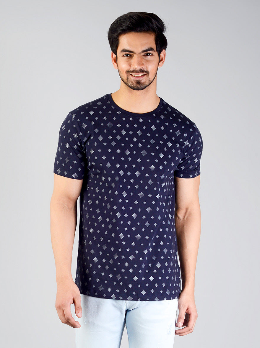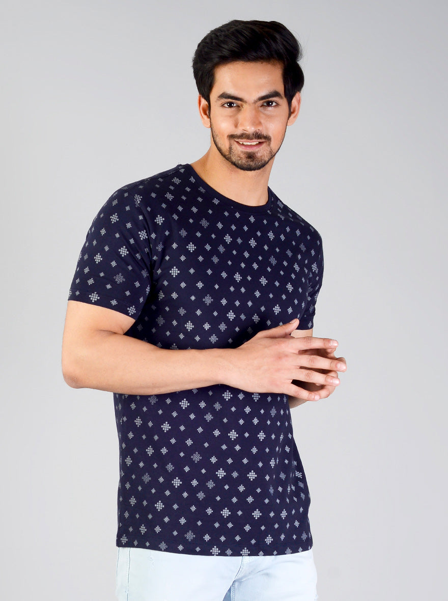Details: This navy blue printed T-shirt by JB Sport will help you to stay fashionable. Made from cotton stretch fabric, this slim fit tee features round neck and half sleeves. This must-have piece will prove to be a worthy addition to your wardrobe.