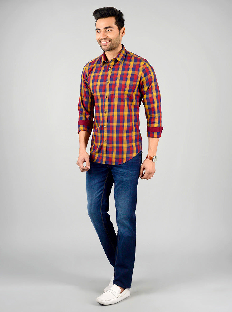 Mustard Yellow & Blue Checked Slim Fit Casual Shirt | Greenfibre