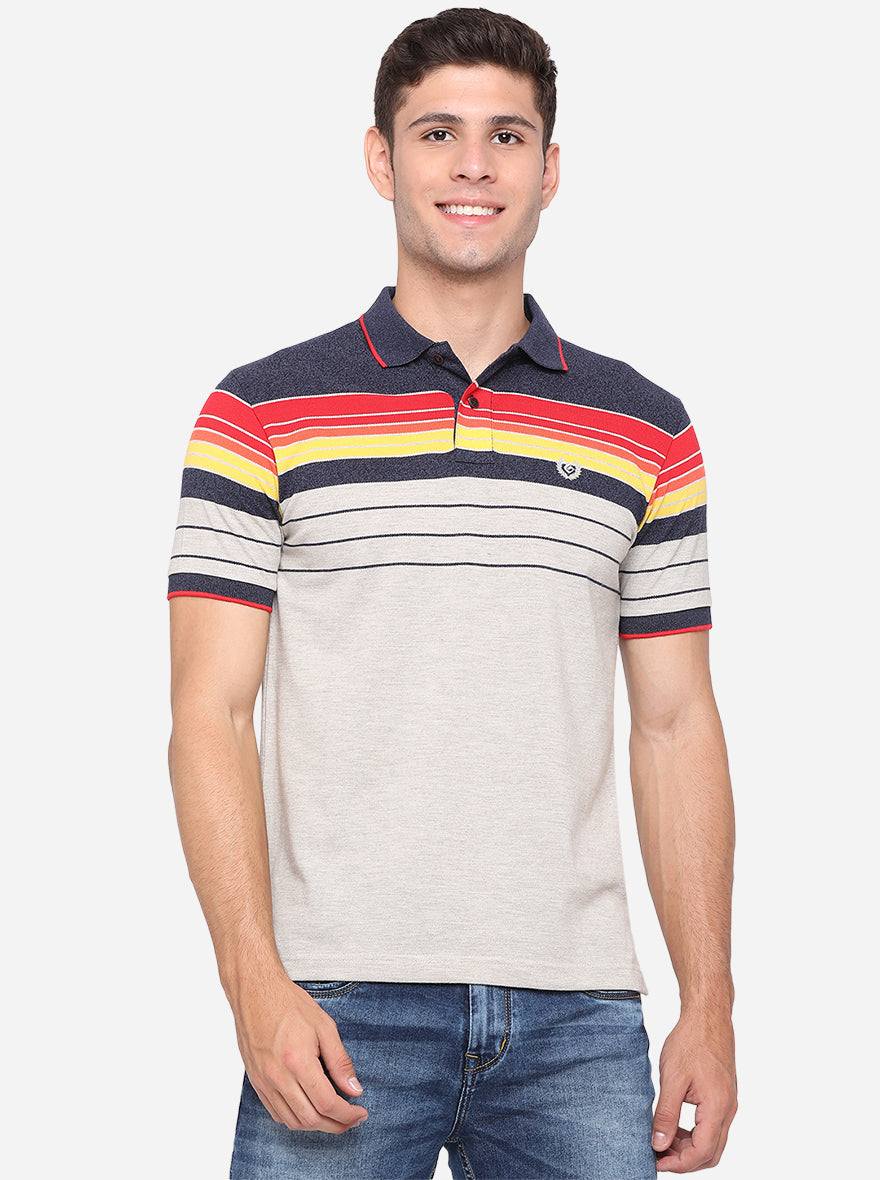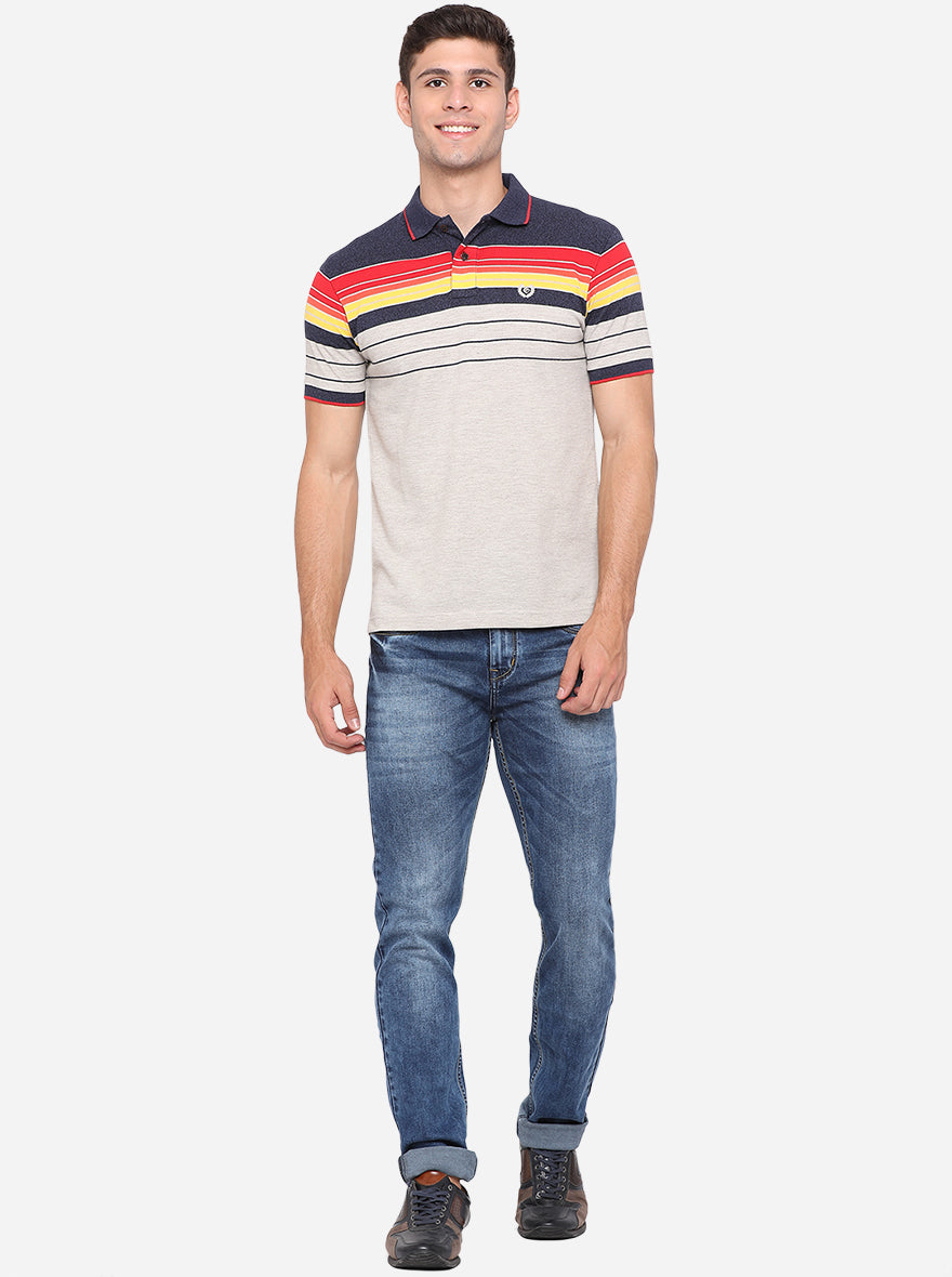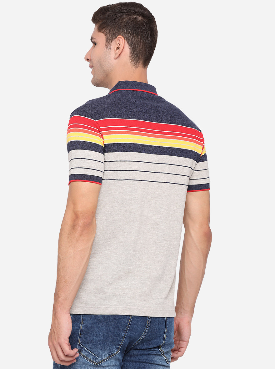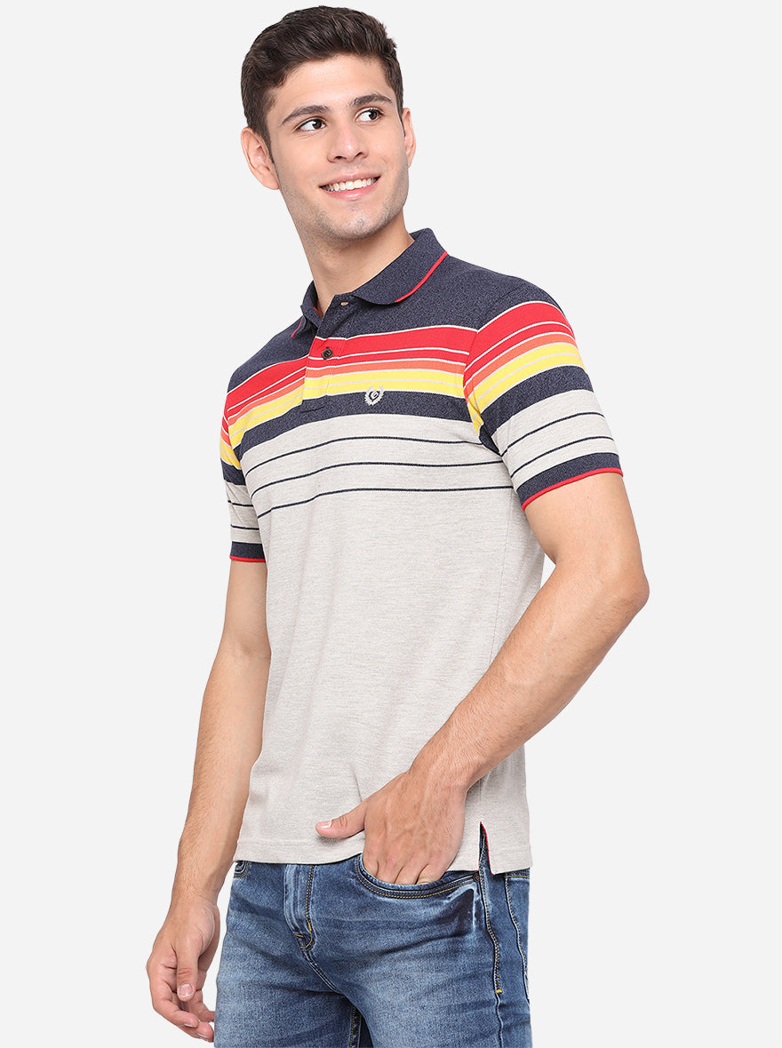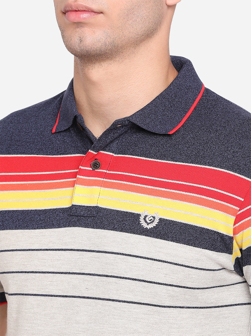 Navy Blue & Grey Striped Slim Fit Polo T-Shirt | Greenfibre