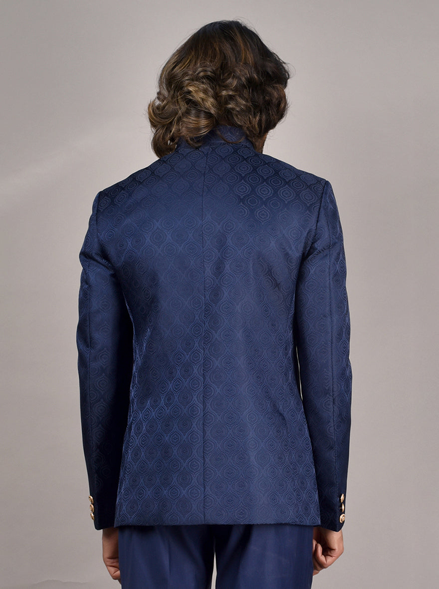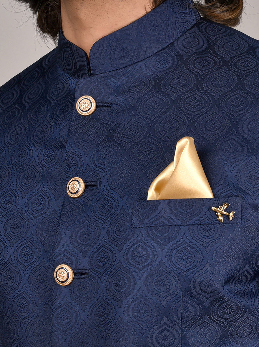 Details: By keeping latest style in mind, this jodhpuri suit from JadeBlue is designed for a modern Indian man. Made from jacquard pattern which has ogee pattern all-over, this suit has navy blue color and gold metal buttons along with golden pocket square. This classic style jodhpuri suit comes with tonal trouser i.e., navy blue coloured trousers. Style it with matching loafers and sleek hairs for complete look.