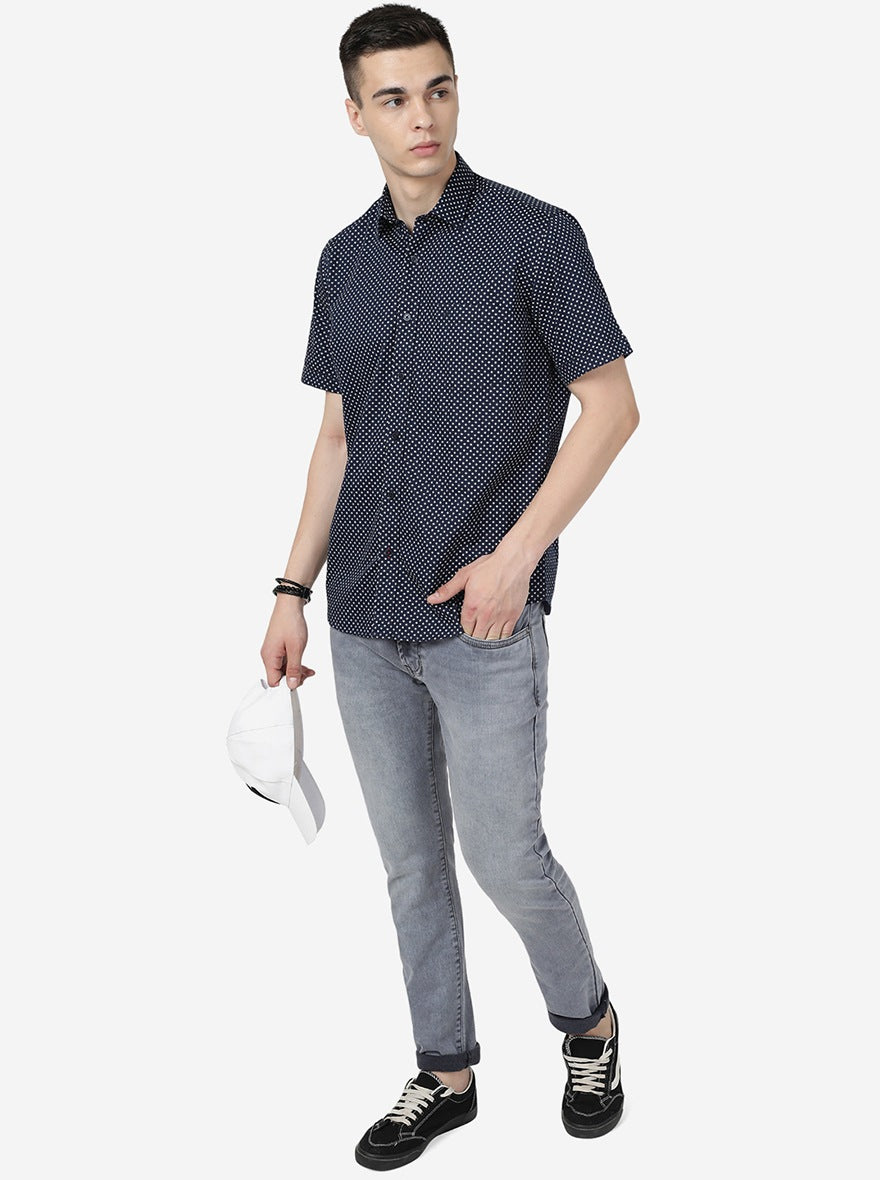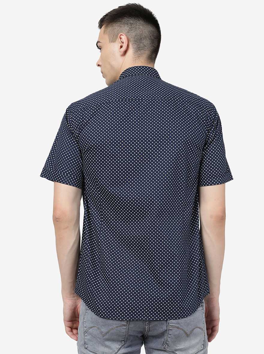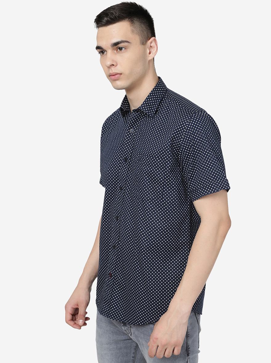 Navy Blue Printed Slim Fit Semi Casual Shirt | JadeBlue