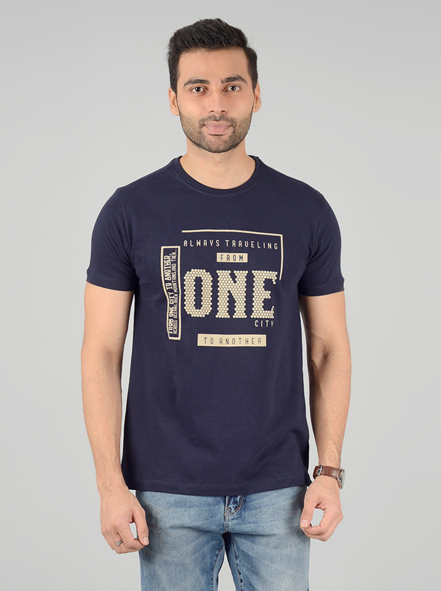 Details: Be cool and comfortable all day long when you step out wearing this printed navy blue T-shirt. Made from cotton fabric, this slim fit tee features round neck and half sleeves. This tee can be paired with metal watch, beige chinos and loafers.