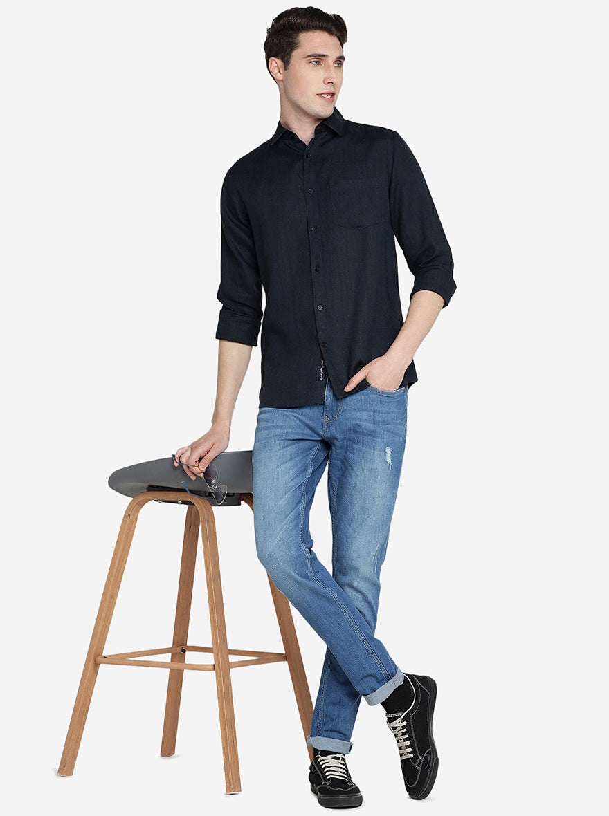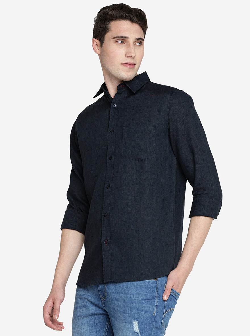 Navy Blue Solid Slim Fit Casual Shirt | JadeBlue