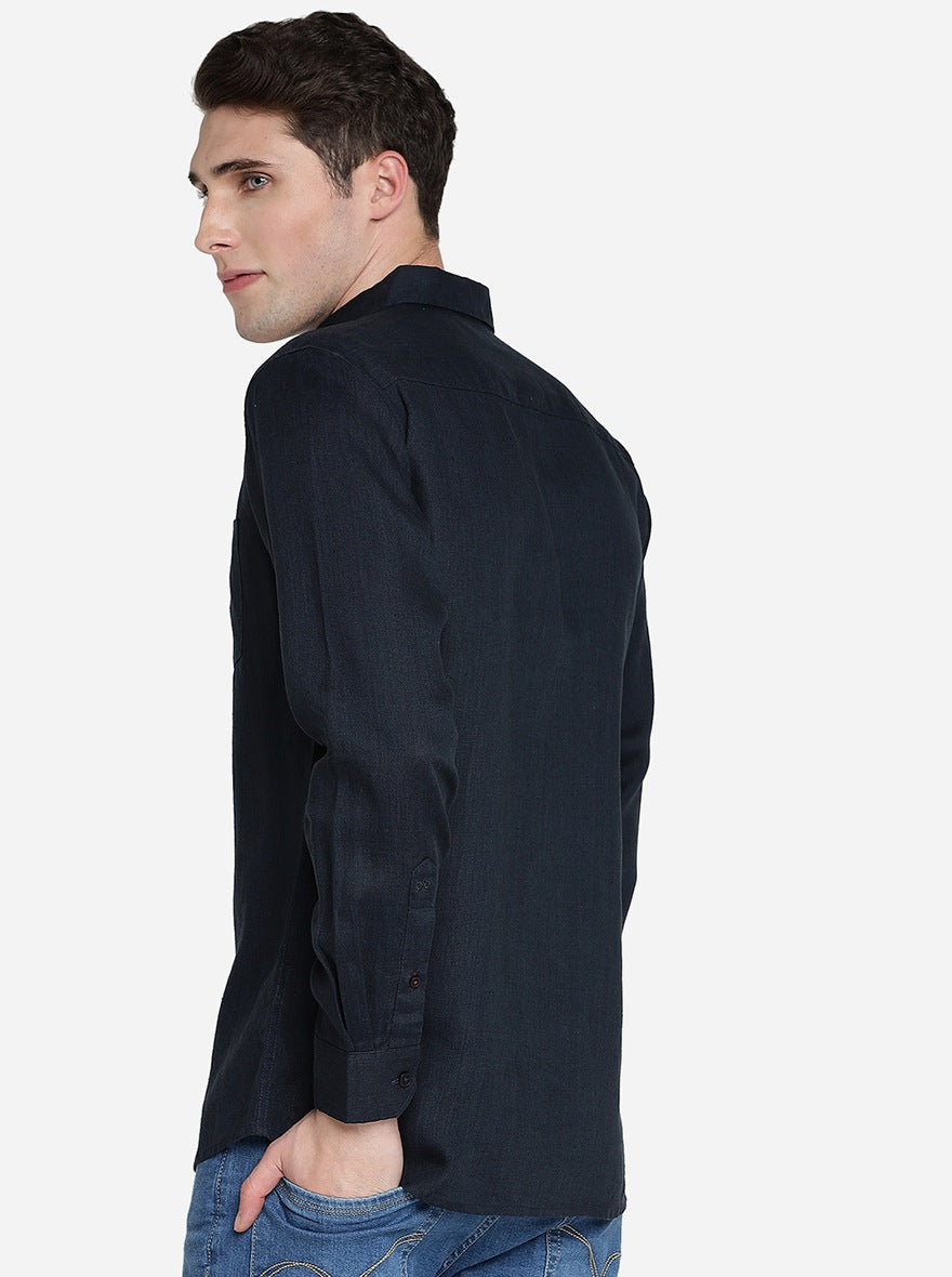 Details: Evergreen styles that is must for your wardrobe, is this Navy Blue 100% Linen Semi Casual Shirt from JadeBlue. Fabricated with 100% Linen promises a comfortable and breathable wearing experience. Offers a slim fit for a sleek look that has been elevated with a solid pattern. Feature a chest pocket, Full sleeves, and a regular shirt collar. Match it with the well-fitted trousers of your choice and a pair of Black oxford shoes and you are ready to go.