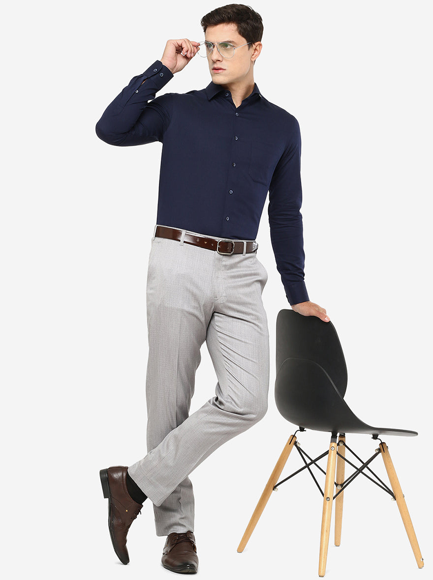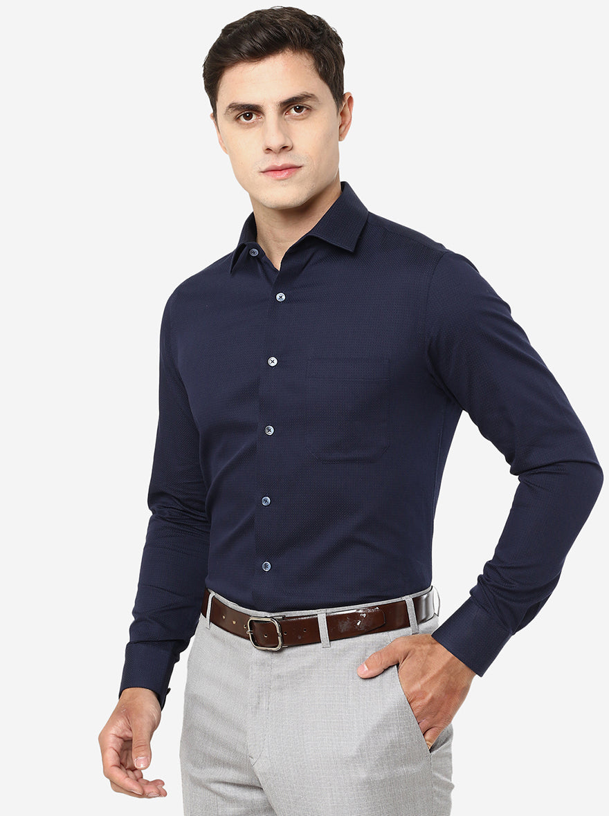 Details: Lend a trendy twist to your formal wear collection by adding this solid navy blue formal shirt to it. Designed to perfection by JadeBlue, this slim fit shirt is made using breathable and soft cotton fabric, which lets your skin breathe comfortably all day long. Features like shirt collar, full sleeves, buttoned cuffs, front buttons placket and chest pocket gives it a meaningful touch. Wear this formal wear with grey self textured trousers, leather belt and brogues to achieve an awe-inspiring formal look.