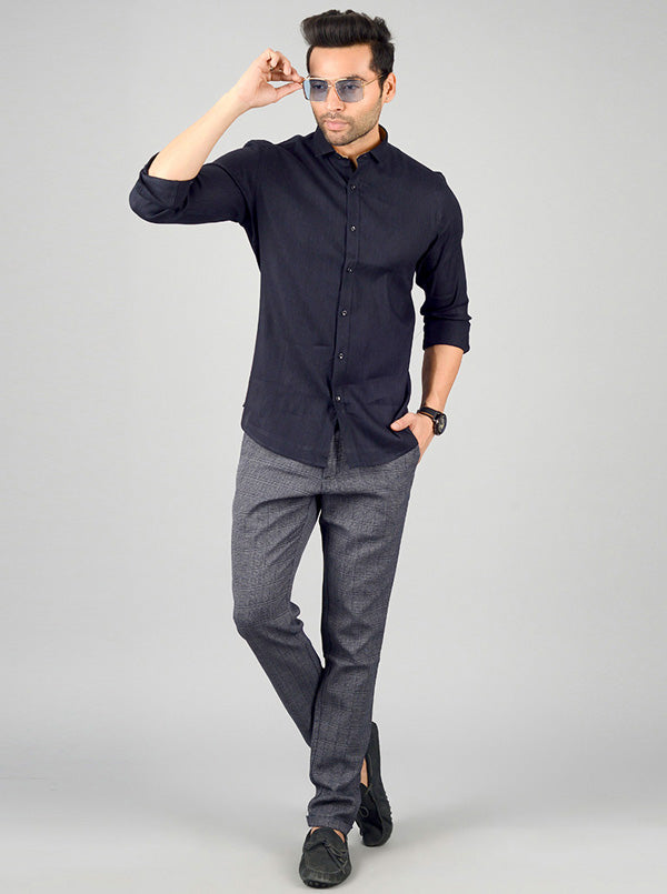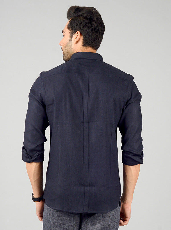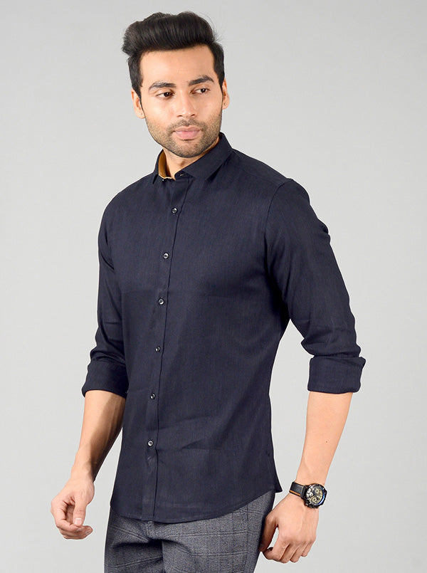 Details: Sport a stylish look at any evening party or event by donning this solid navy blue party wear shirt. Made from linen lycra fabric, this slim fit shirt features shirt collar, front buttons closure and full sleeves.