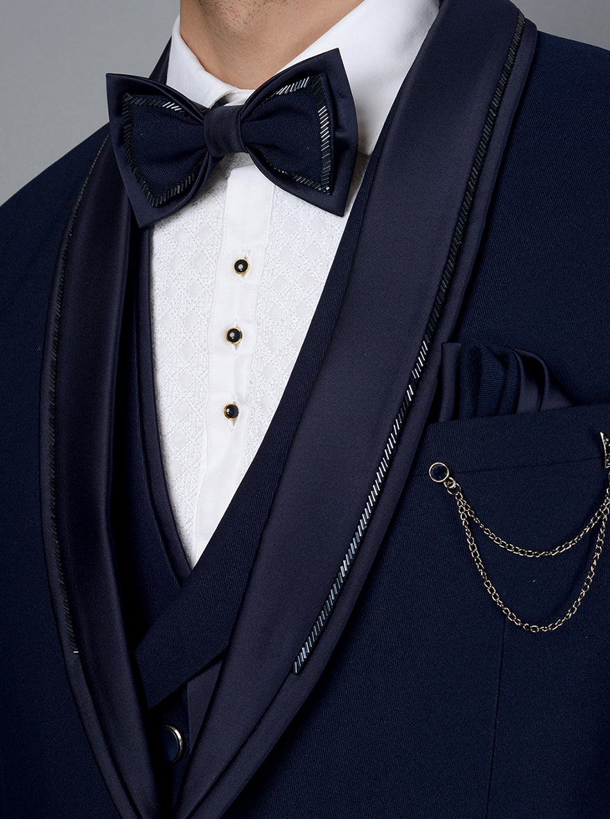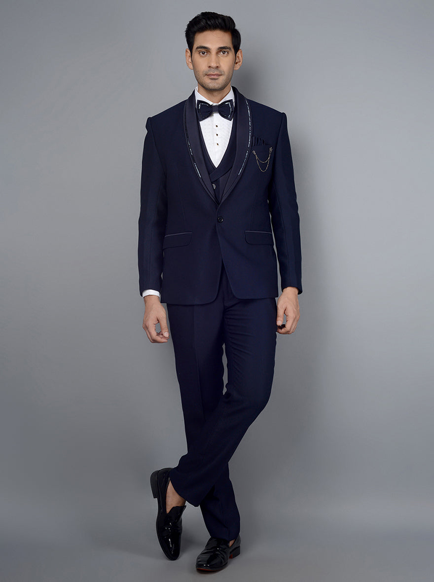 Details: This Navy Blue Suit is a gorgeous piece from the latest collection of JadeBlue. Crafted with Polynosic fabric which is a blend of polyester and rayon fibres, with a soft, silky finish. Featuring one button for closure along with three pockets on blazer and white shirt & vest. Self-designed on the Blazer. Offers a classic fit for a look with a peak lapel collar. Perfect for Receptions and other occasions.