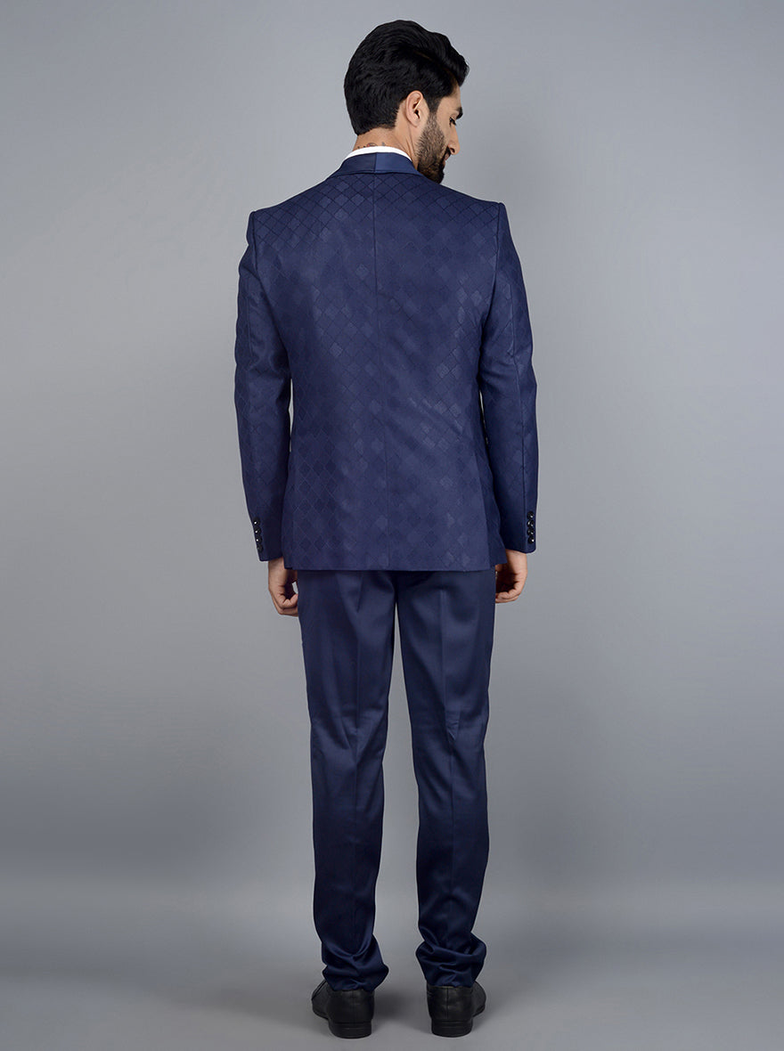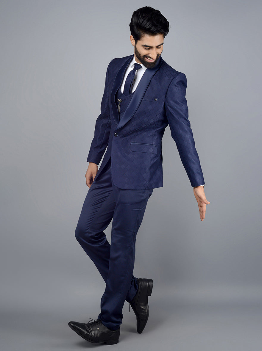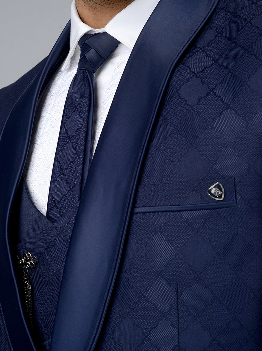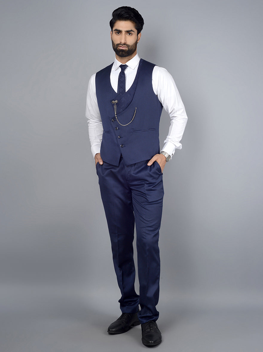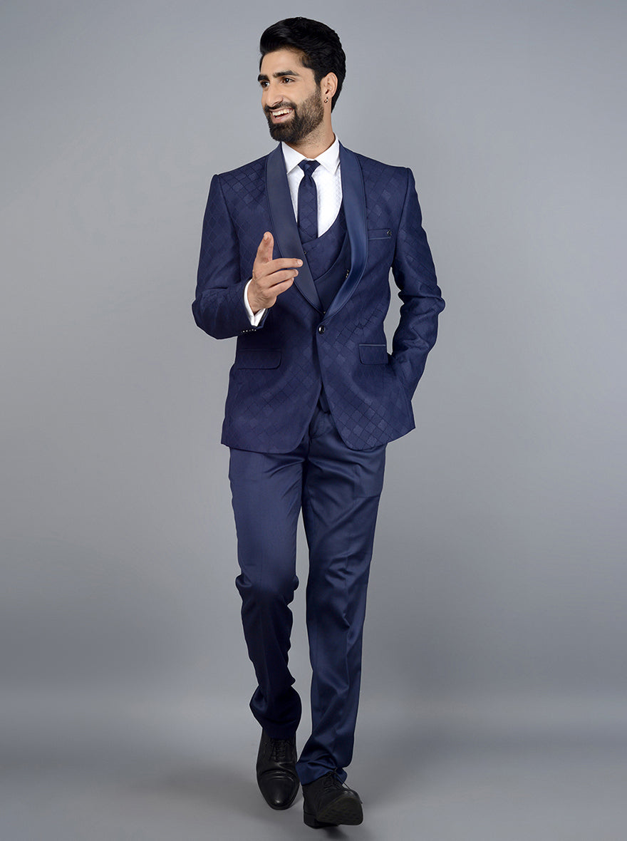 Details: This Navy Blue Suit from the newest collection from JadeBlue is a masterpiece of this season. Crafted with Jacquard fabric that provides an elegant and royal look. Featuring one button for closure along with three pockets on blazer and white shirt & vest. Self-designed on the Blazer. Offers a classic fit for a look with a peak lapel collar. Perfect for Receptions and other occasions.