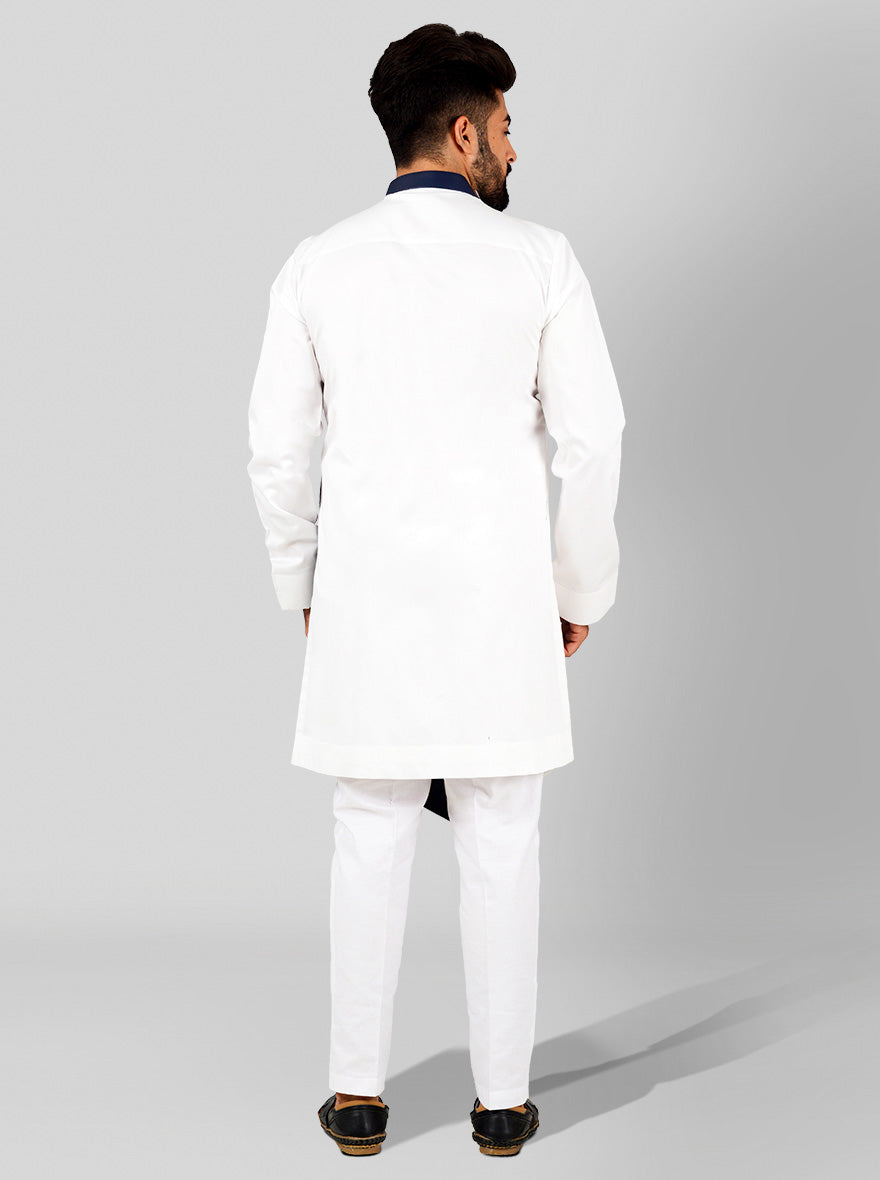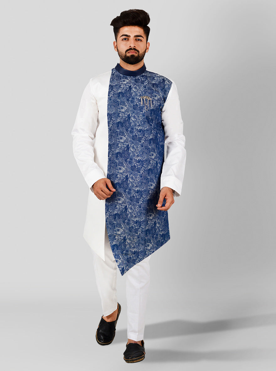 Details: This navy blue and white kurta by Azania is designed to meet style demands of fashion conscious men. Made from cotton satin fabric, this regular fit mens kurta features partially floral print and plain pattern, which adds to the drama. It is styled with banded buttoned collar and full sleeves, which adds a functional touch to this traditional wear.