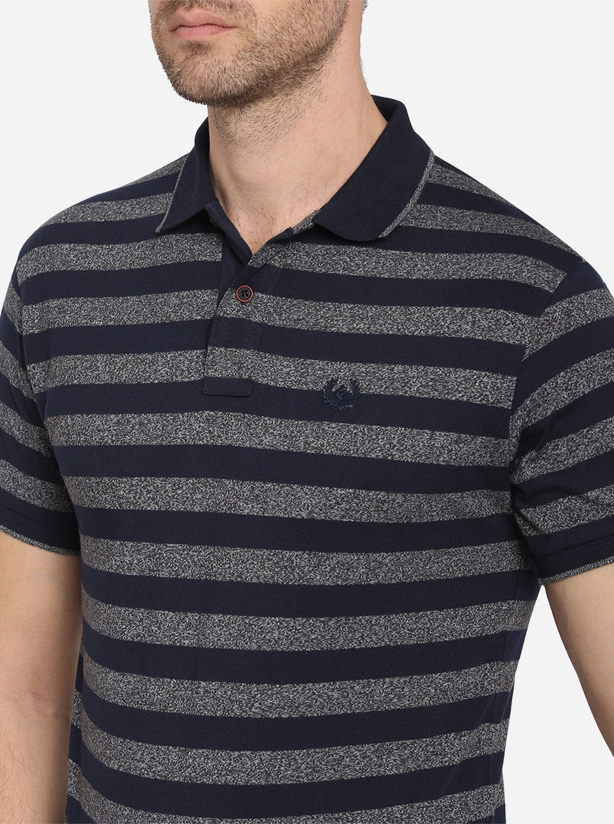 Night Blue & Grey Striped Slim Fit Polo T-shirt | Greenfibre