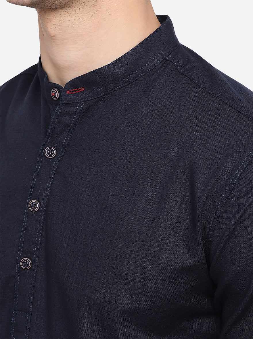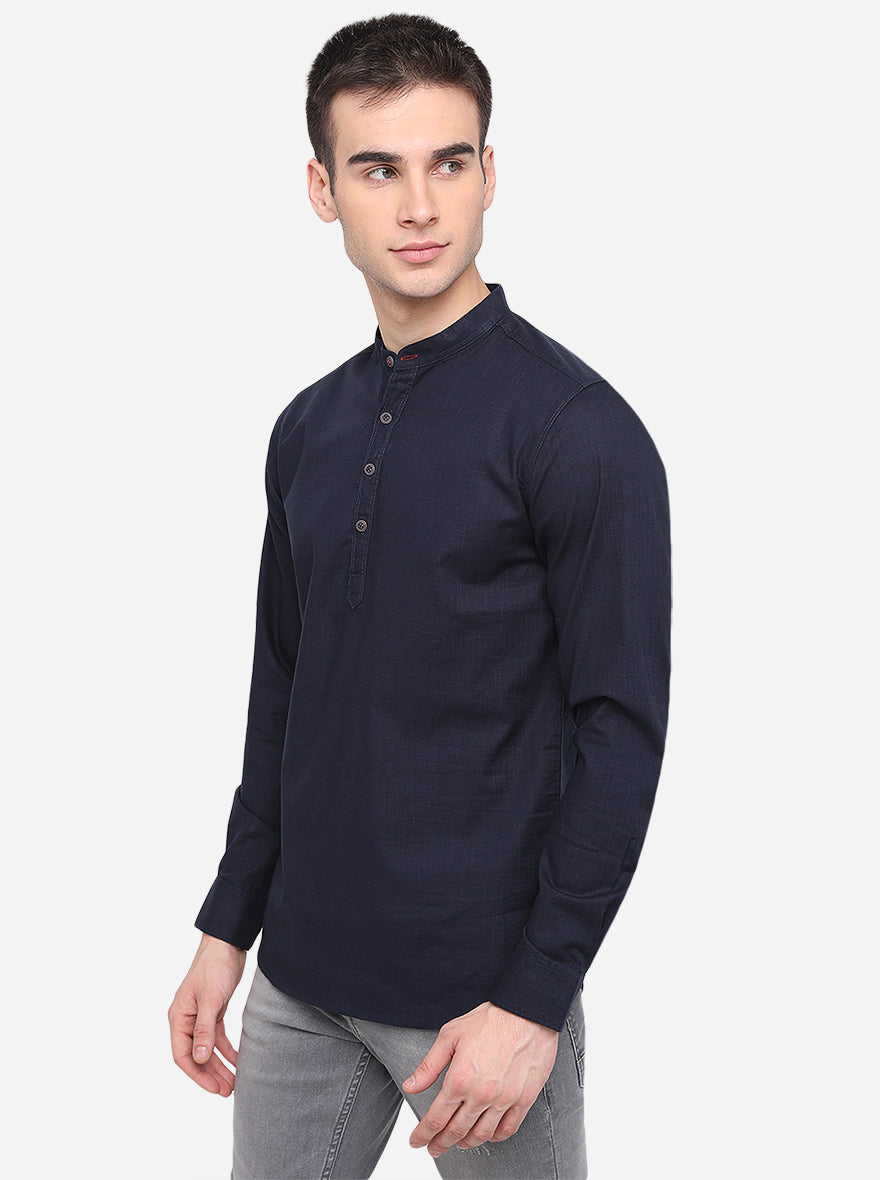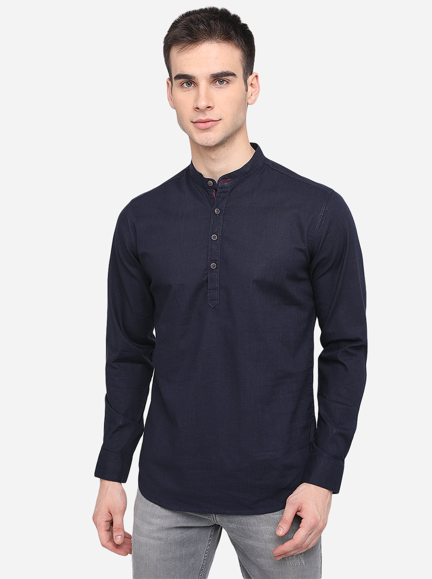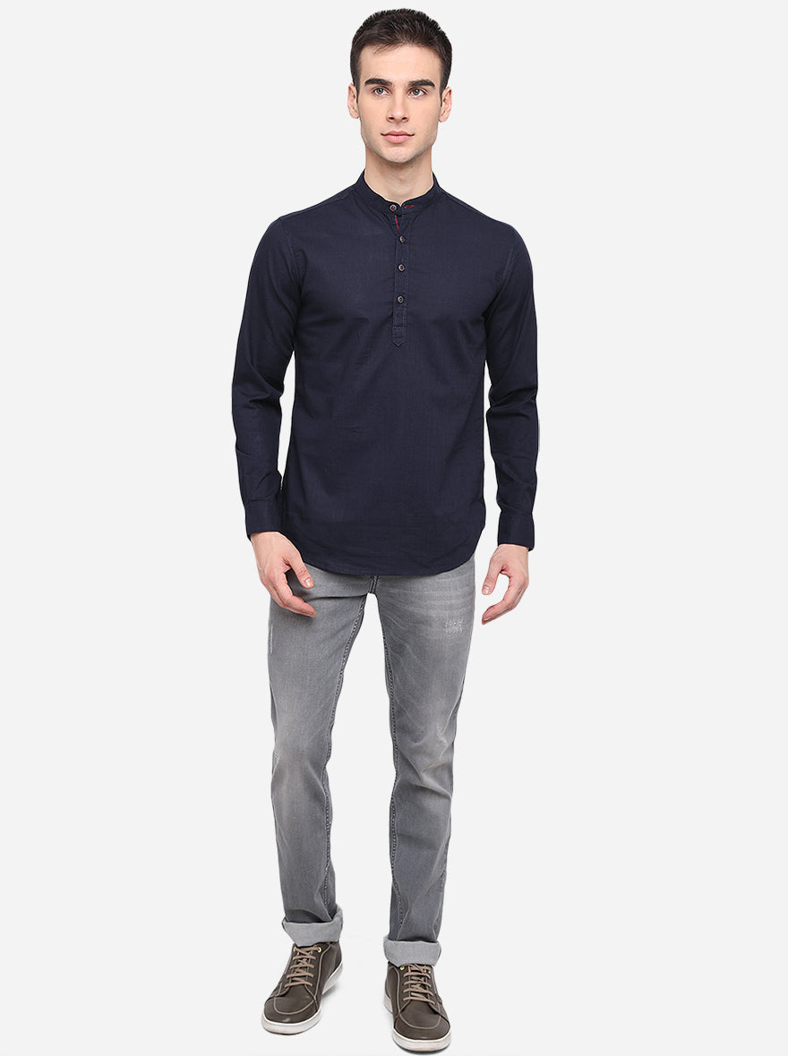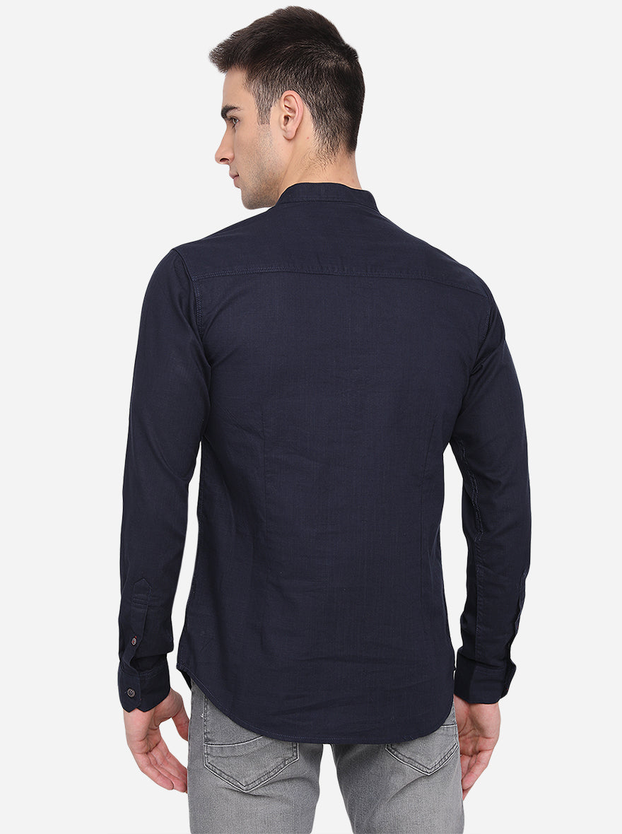 Details: Create a dapper look wearing this semi casual Night-Blue shirt from the latest collection of Greenfibre. It features a mandarin collar, full-sleeves and offers a slim fit. It is adorned with a solid pattern, making up for a classy choice. Crafted with pure cotton that takes care of your comfort all day long. Perfect for semi casual wear. Match it with a pair of smart blue jeans and sneakers and you are all set to go.