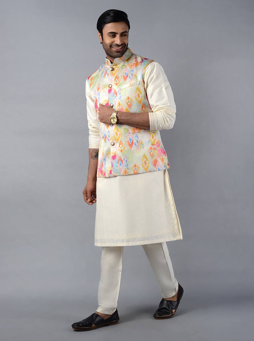Details: Smarten up Your Ethnic Identity with This Classic Straight Cut, Off-white Regular Fit Bandhgala Jacket, from TULA. Made of Multi Diamond Self Designed, Durable & Strong Majesticly Printed Jacquard Fabric. Promising The Cozy feels, Rich feels and Keeps you Well-Hugged Throughout the Clock, with it's Regular-Comfort Fit Feature. Adorned with round virtuous buttons and pocket placements. Gleaming White Kurta Set with Kolhapuri Footwears, will be a tremendous match for it. Authentic for Pre wedding rituals and other traditional events.