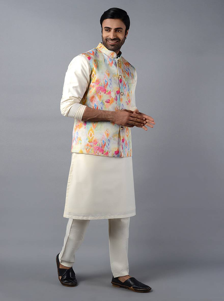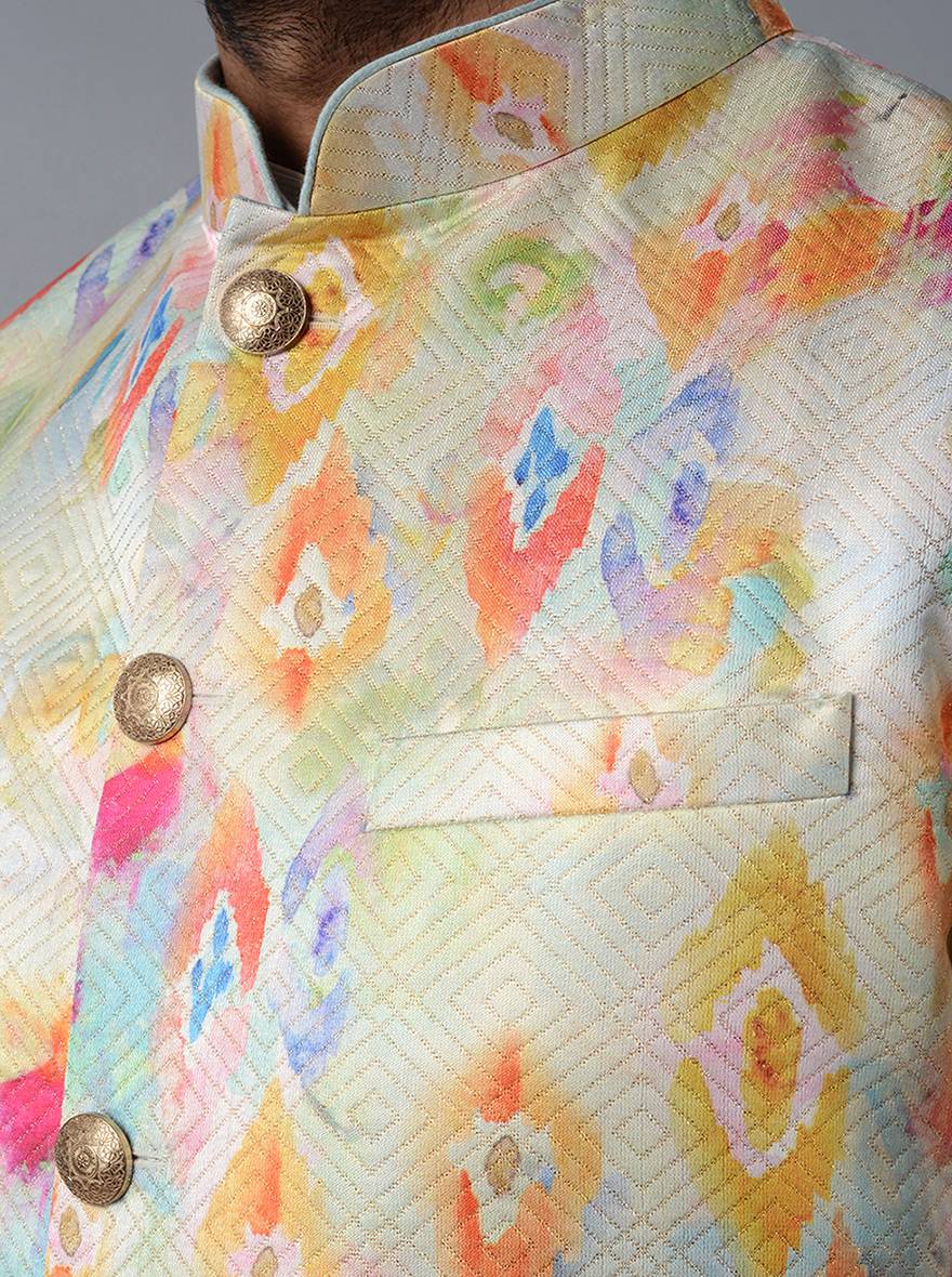 Off-White Printed With Self Design Regular Fit Bandhgala Jacket | TULA