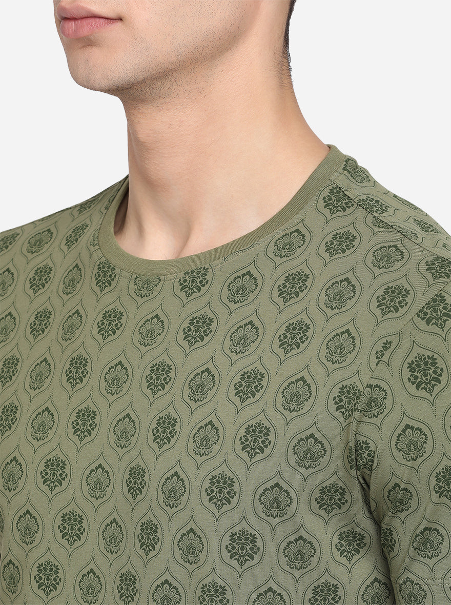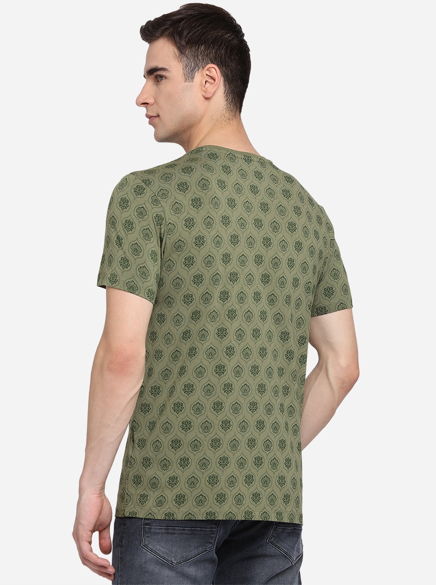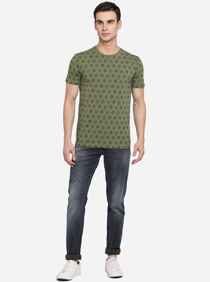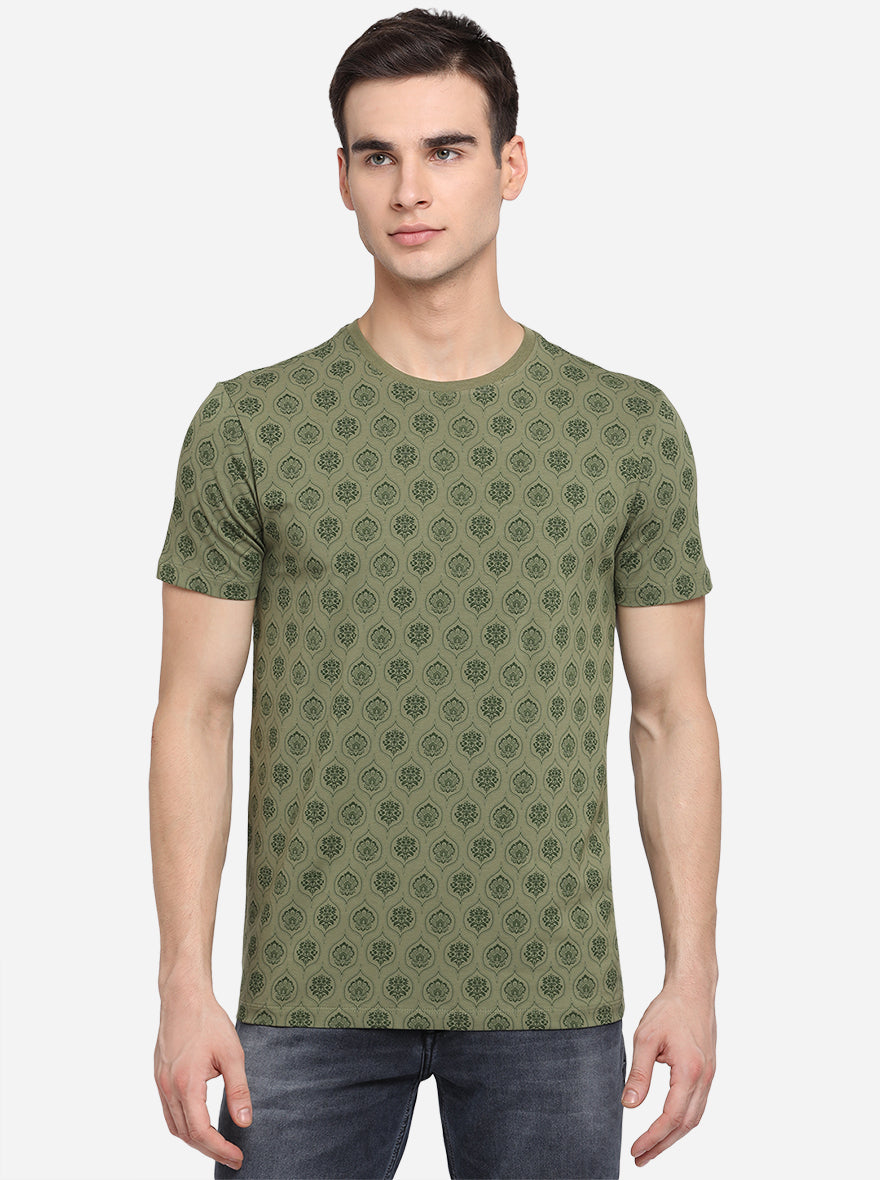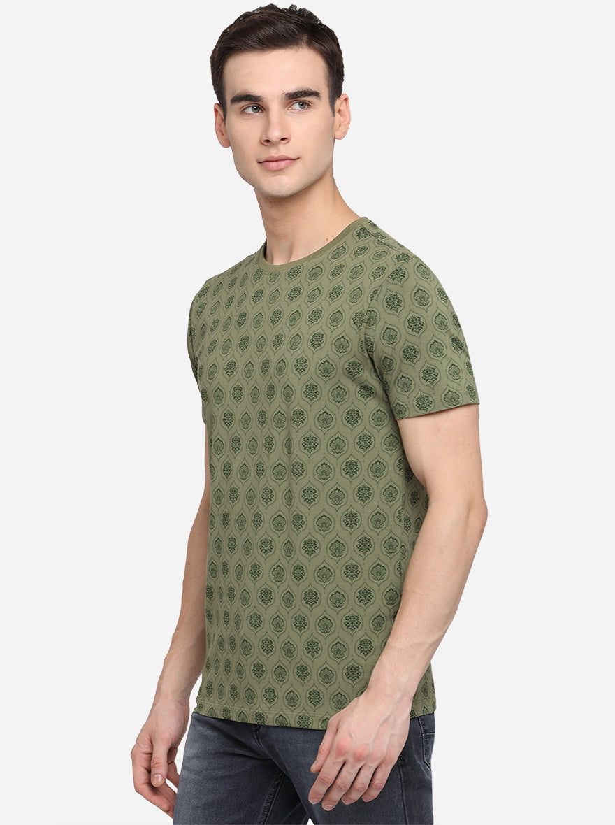 Olive Green Printed Slim Fit T-Shirt | JadeBlue