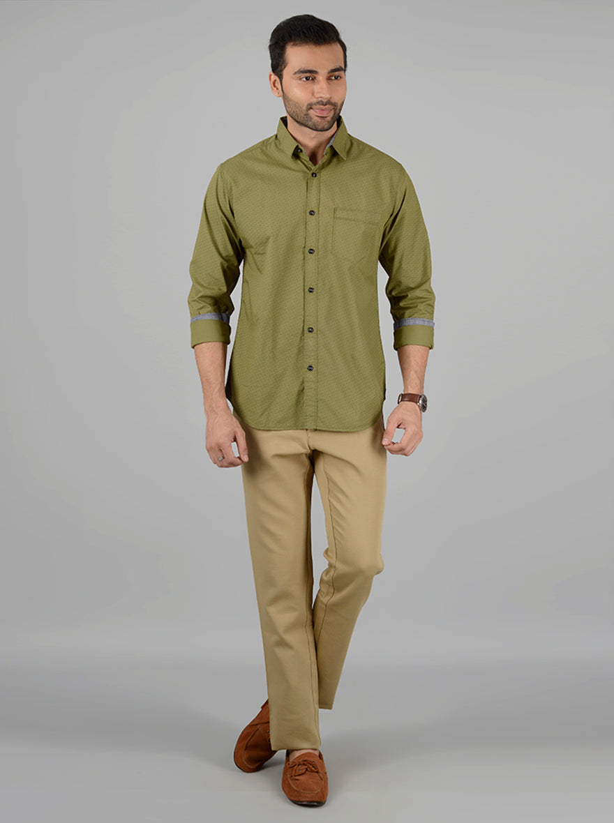 Details: Men, who like to wear simple yet stylish shirts should opt for this printed olive shirt. This alluring casual shirt features a standard shirt collar, chest pocket and contrast cuffs. Its cotton fabric will keep you comfortable and relaxed all day long. Pair it with black cotton pants and sandals.