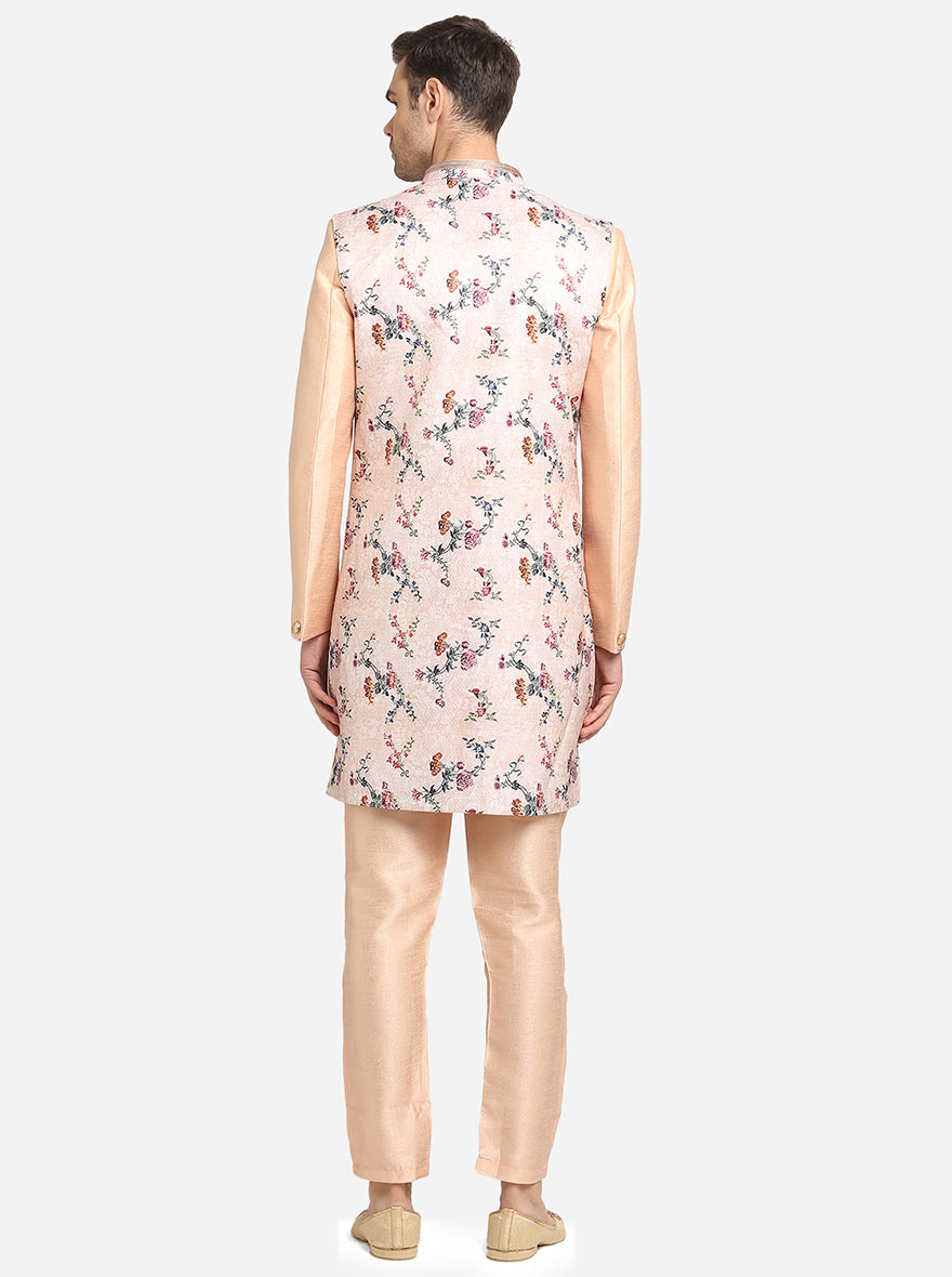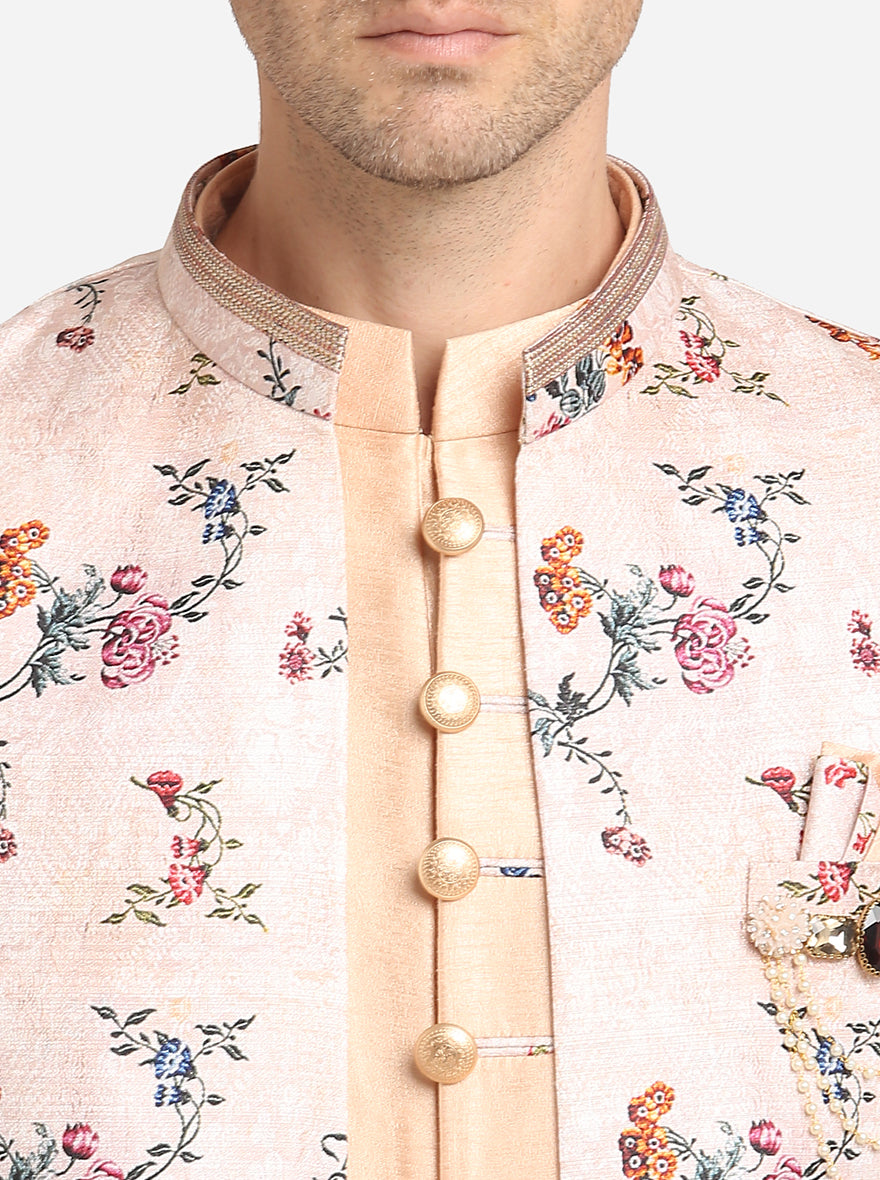 Details: You are going to fall in love with your outfit wearing this Orange and Cream Indowestern from the brand Azania. The set includes a coat and a pant. The coat features a mandarin collar and full-sleeves. Comes with a straight button front and a slit on the lower front. Adorned with a printed pattern, making up for a classy choice. Made with rich Jacquard, that assures a good comfort and a rich feel to the skin. Perfect for Indian weddings and formal events. Tag it with a pair of jutti to complete the look like a pro.