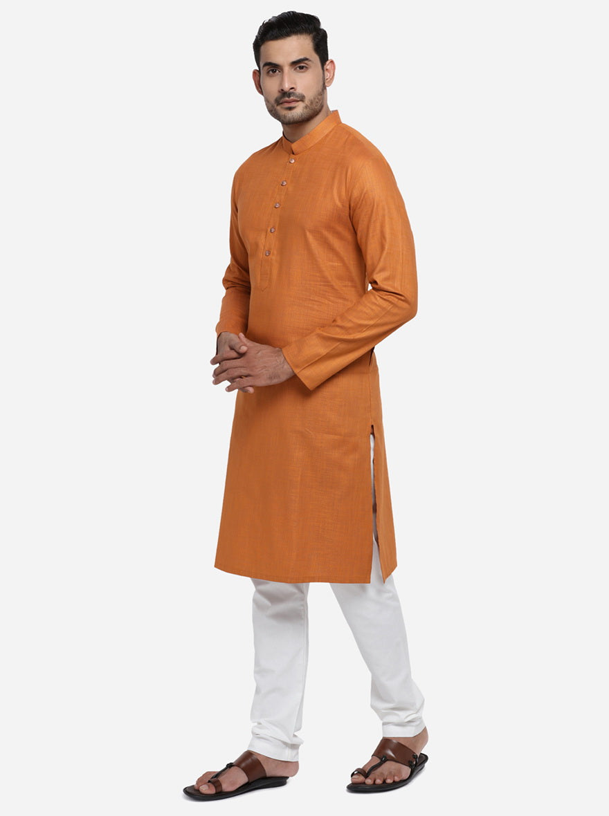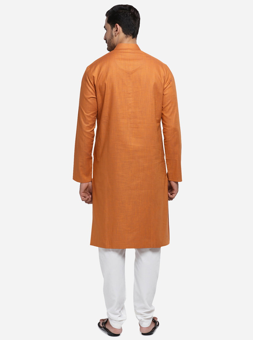 Let your style do the talking for you when you step out wearing this appealing Orange Self Design kurta. This regular fit kurta will become your wardrobe favorite, owing to its impeccable features.