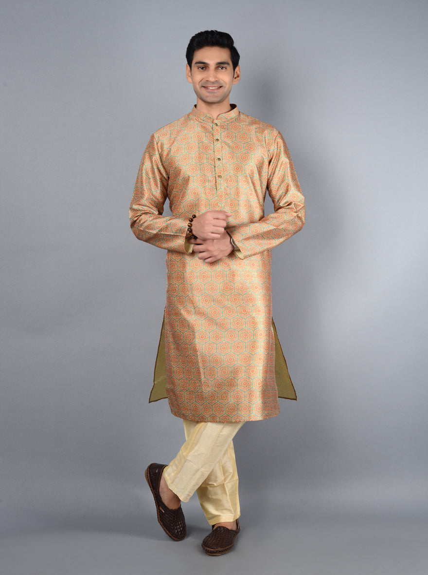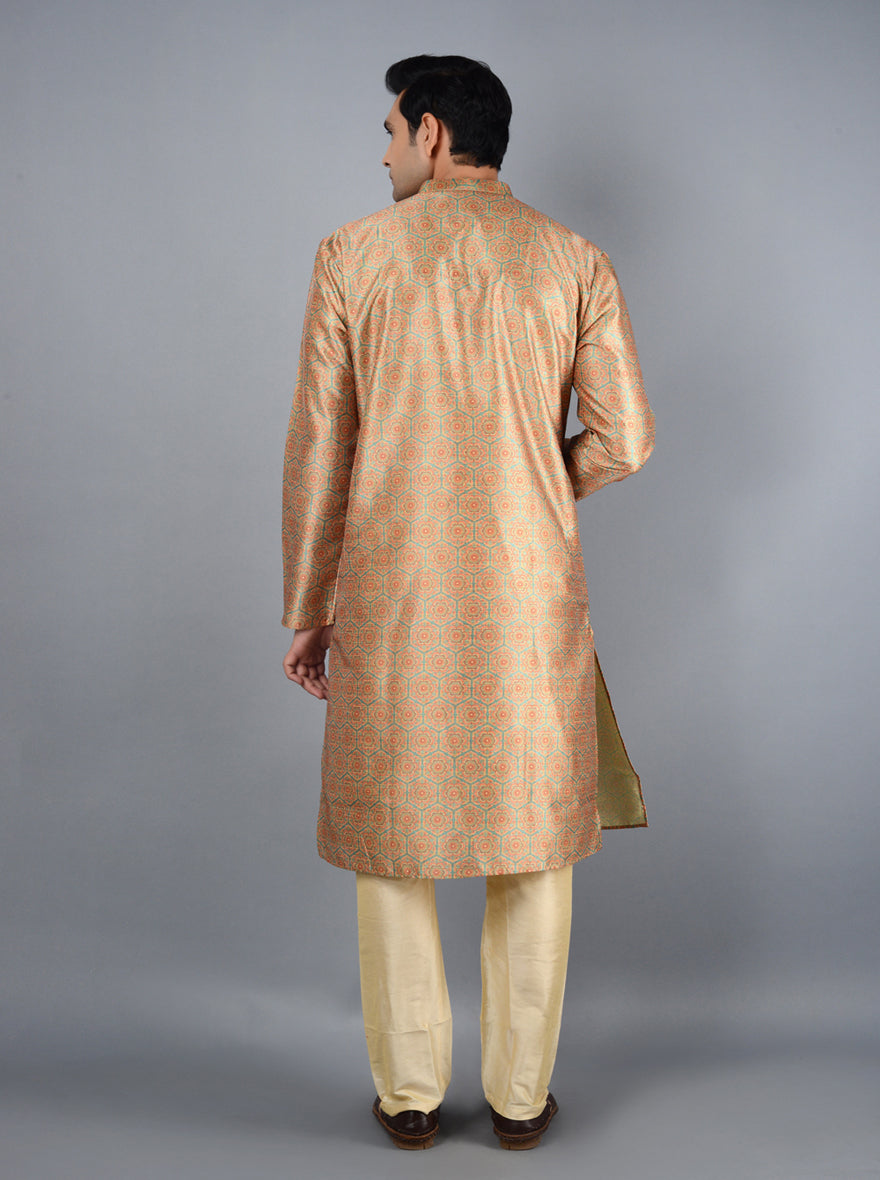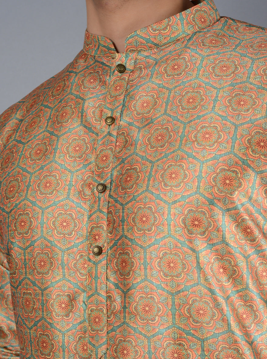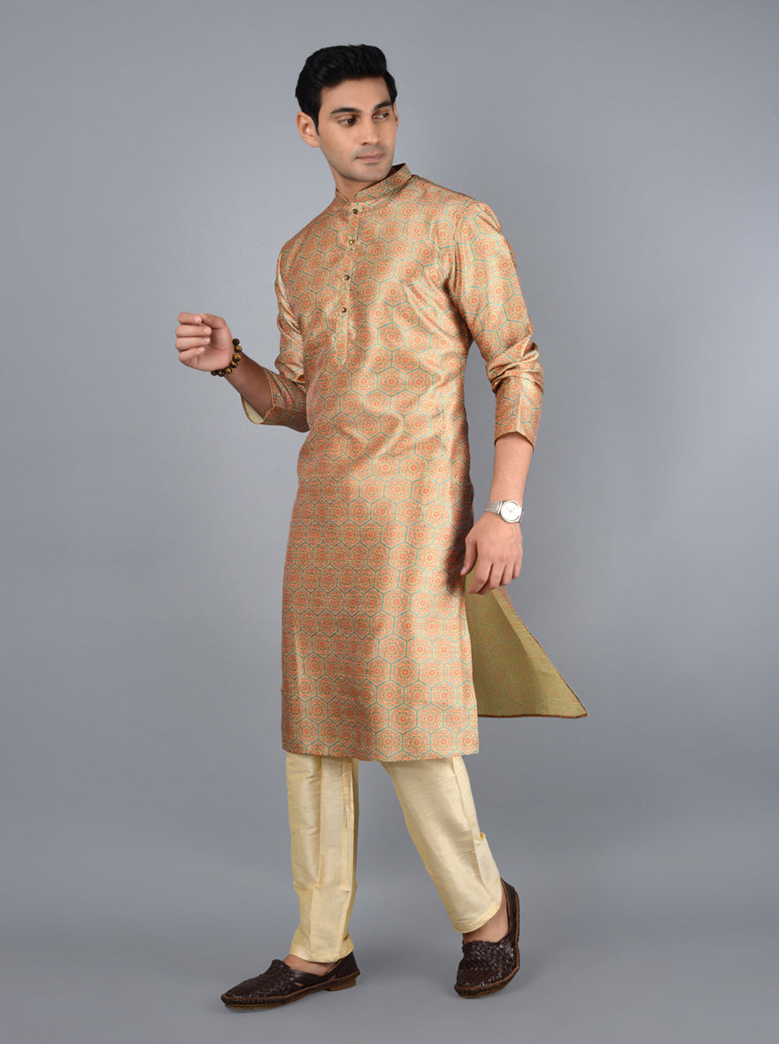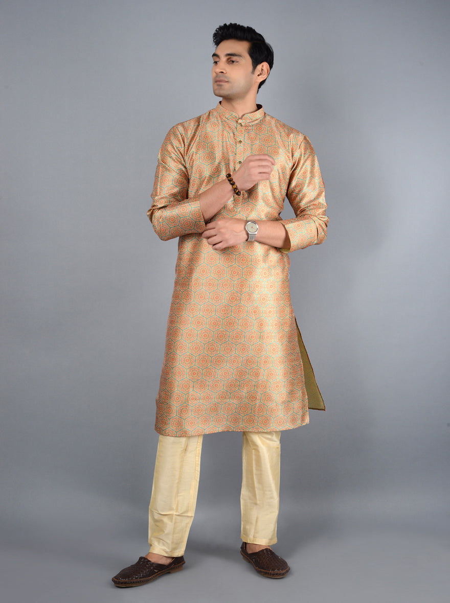 Details: Azania Men's Classic, Straight Orange Printed Kurta Set