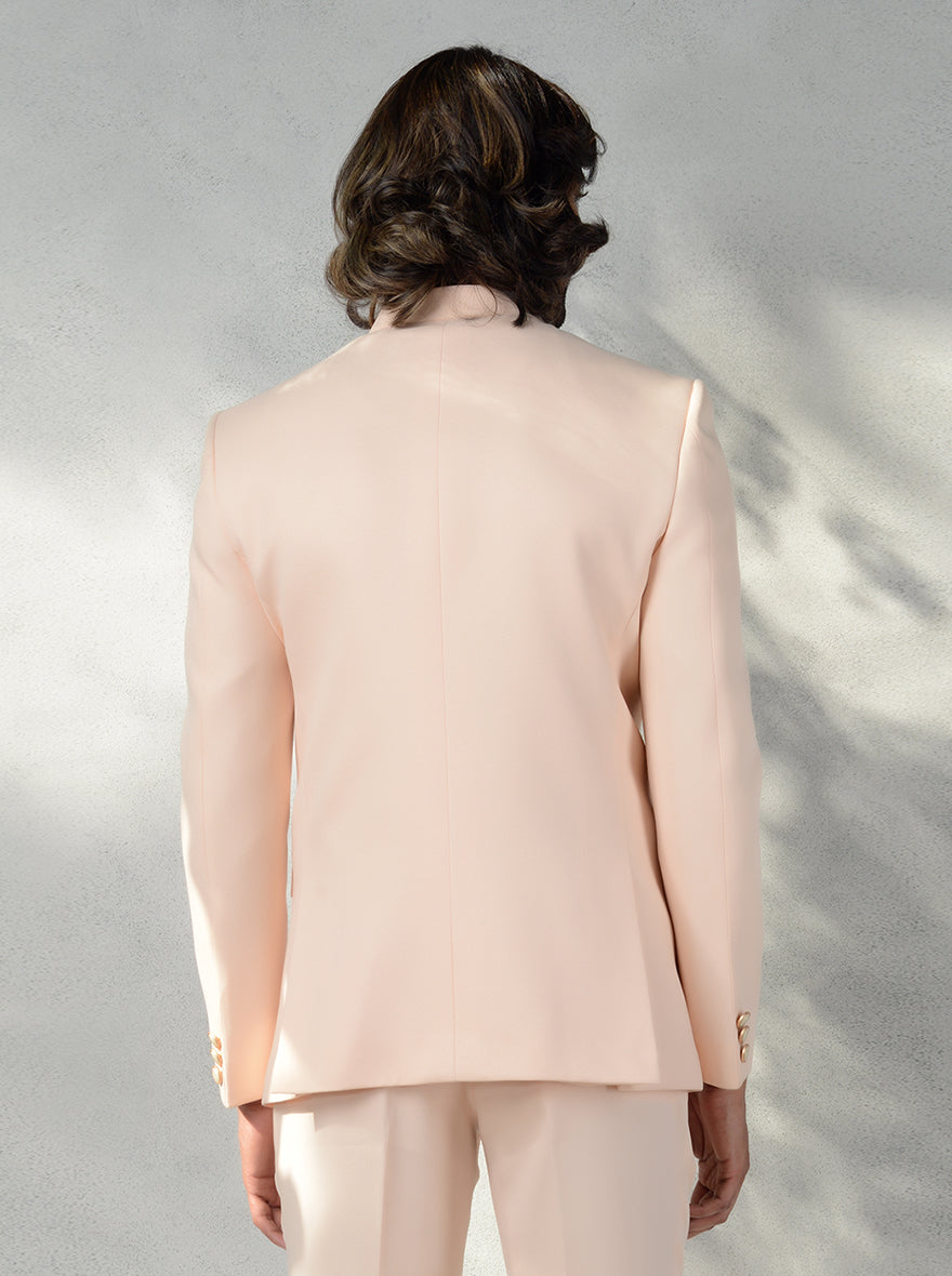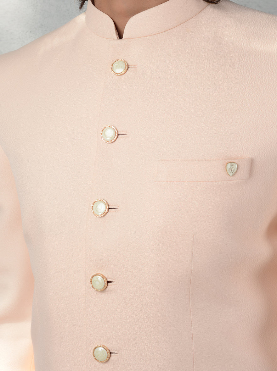 Details: Amplify your wardrobe with this peach jodhpuri suit from JadeBlue. Tailored to perfection, it has pockets on sides along with pocket on chest with a subtle metal buttons and a brooch. The sleeves are also complimented by subtle metallic buttons on hem. The polynosic fabric in trendy pastel peach color renders it a fashionable taste. It comes with same tonal slim fit trouser to compliment the jodhpuri. Match it with loafers and your killer smile for any occasion.