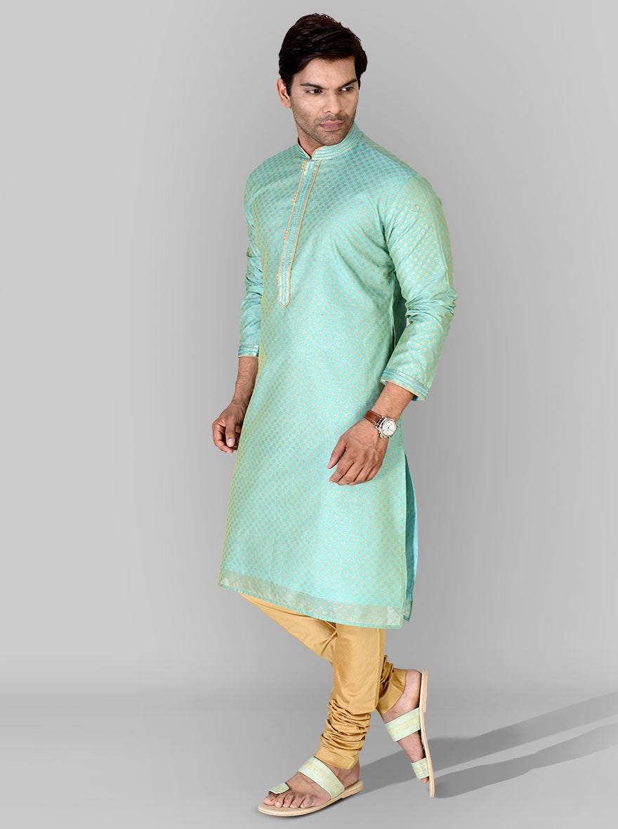 Details: Considering that most people wear regular colours, the Persian green pinted silk kurta by Azania is perfect for you to stand out in a room. This attire is perfect for any man who is looking for a break from the regular daily outfits. It is a straight fitl, full sleeved , knee length kurta with a small checkered pattern printed on it and a mandrain collar. The fabric used is silk that makes it a soft and comfortable garment. It has a subtle colour palette which is also a cool choice for the summers. It is out of the box and yet sophisticated. The ensemble is inclusive of the kurta and is paired up with beige churidars and fancy slip-ons . You can also pair it up with kolhapuris and slips-on along with a nice smart watch for a trendy semi casual look that would be perfect for any semi casual occasion or wedding parties. -Silk -Printed -Full sleeves-Kurta -Regular fit