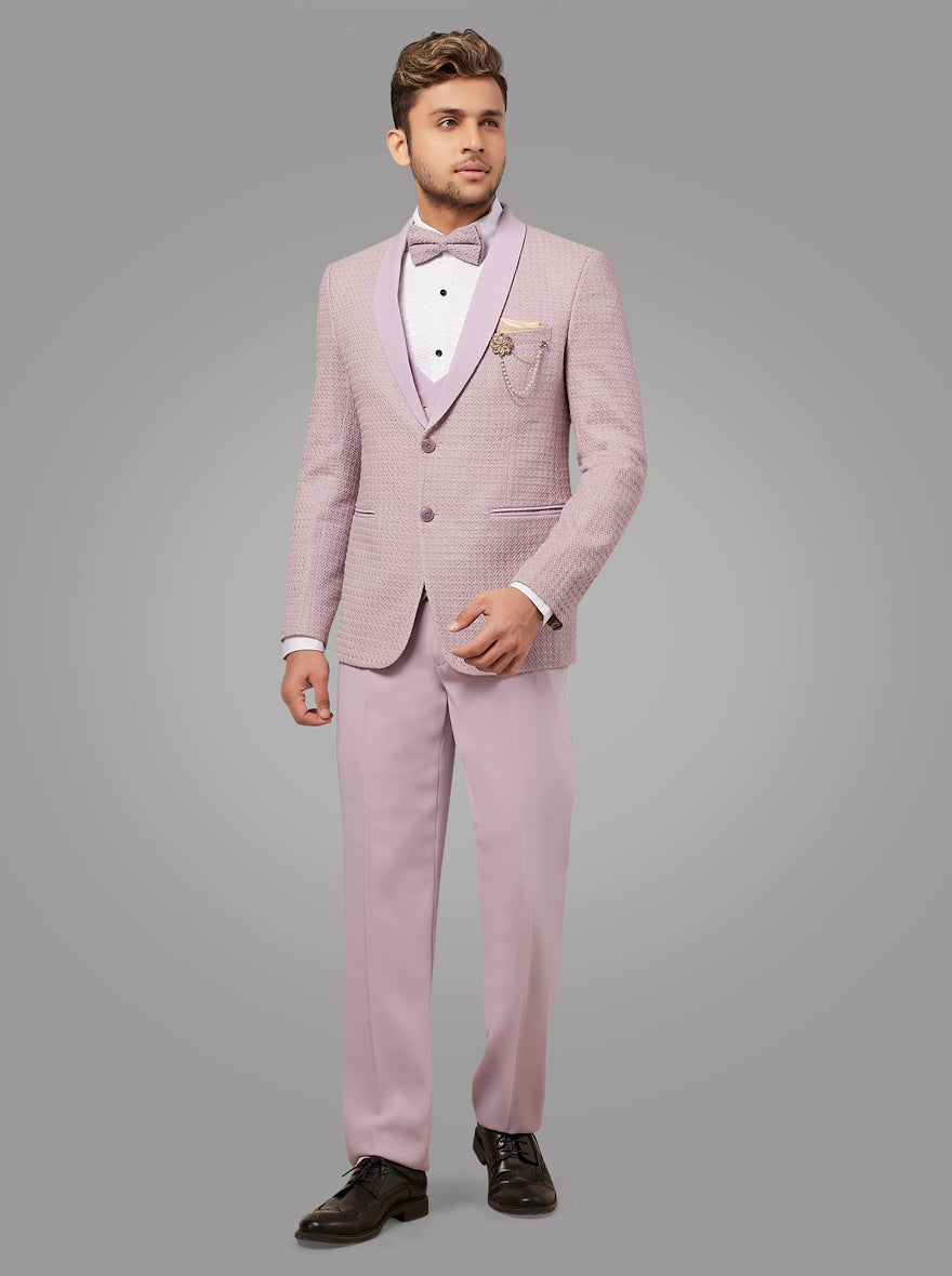 Details: This Pink Suit from the latest collection of JadeBlue is the wedding essential. Crafted with premium Terry Rayon Fabric that gives formal and partywear look as well as is comfortable. Featuring buttons for closure along with three pockets on blazer and white shirt & vest. Offers a classic fit for a look with a collar. Perfect for Formal Parties and other occasions.