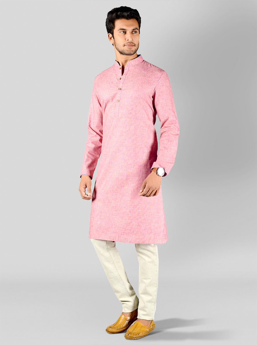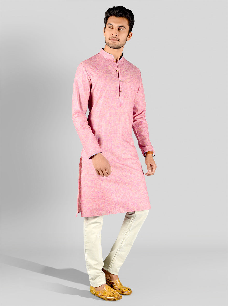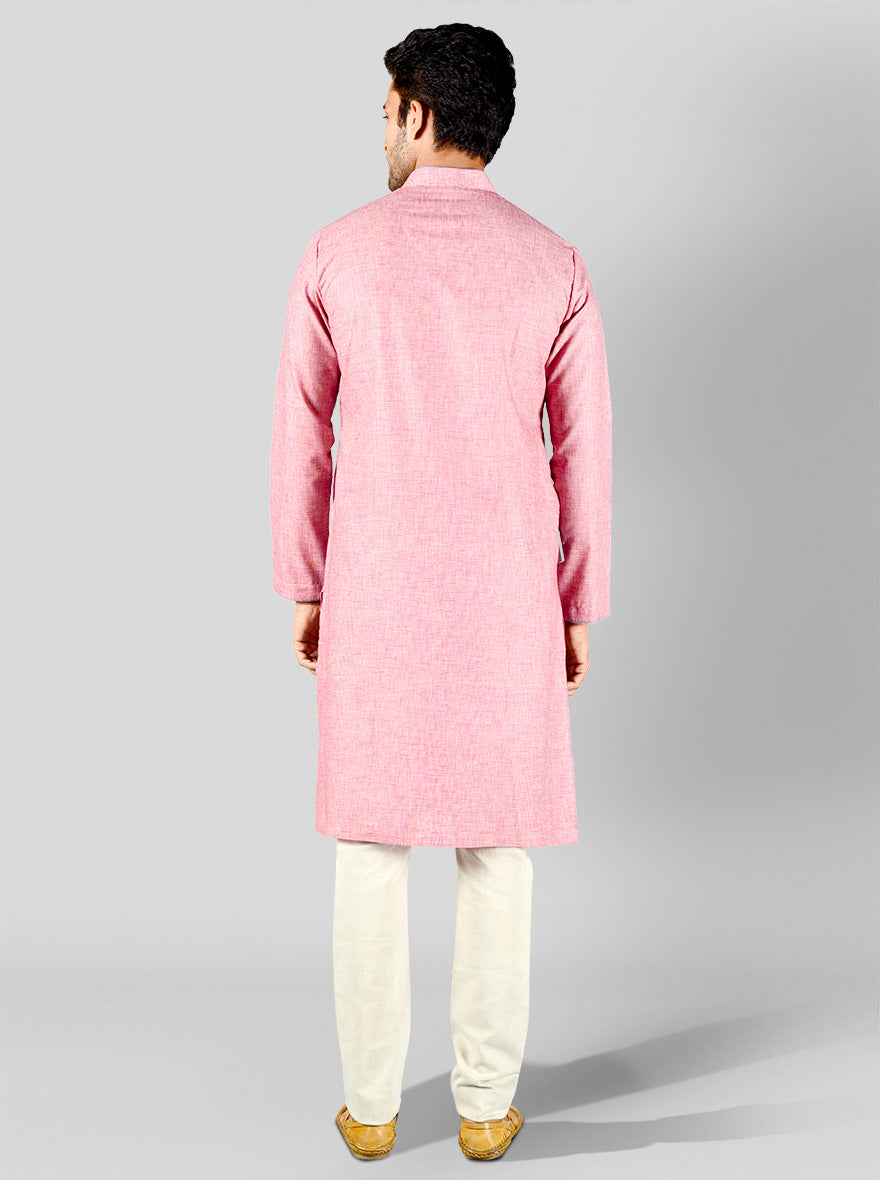 Details: Achieve an elegant look by donning this pink kurta. Made from cotton fabric, this mens kurta features stitching detail, which takes the form of stripes pattern. Its mandarin collar, front button placket and side slits, which add up to bestow it with a complete look. The full sleeves of this kurta for men offers proper coverage to your hands. If you like to buy captivating kurtas, then you should not miss on buying this creation by Azania.