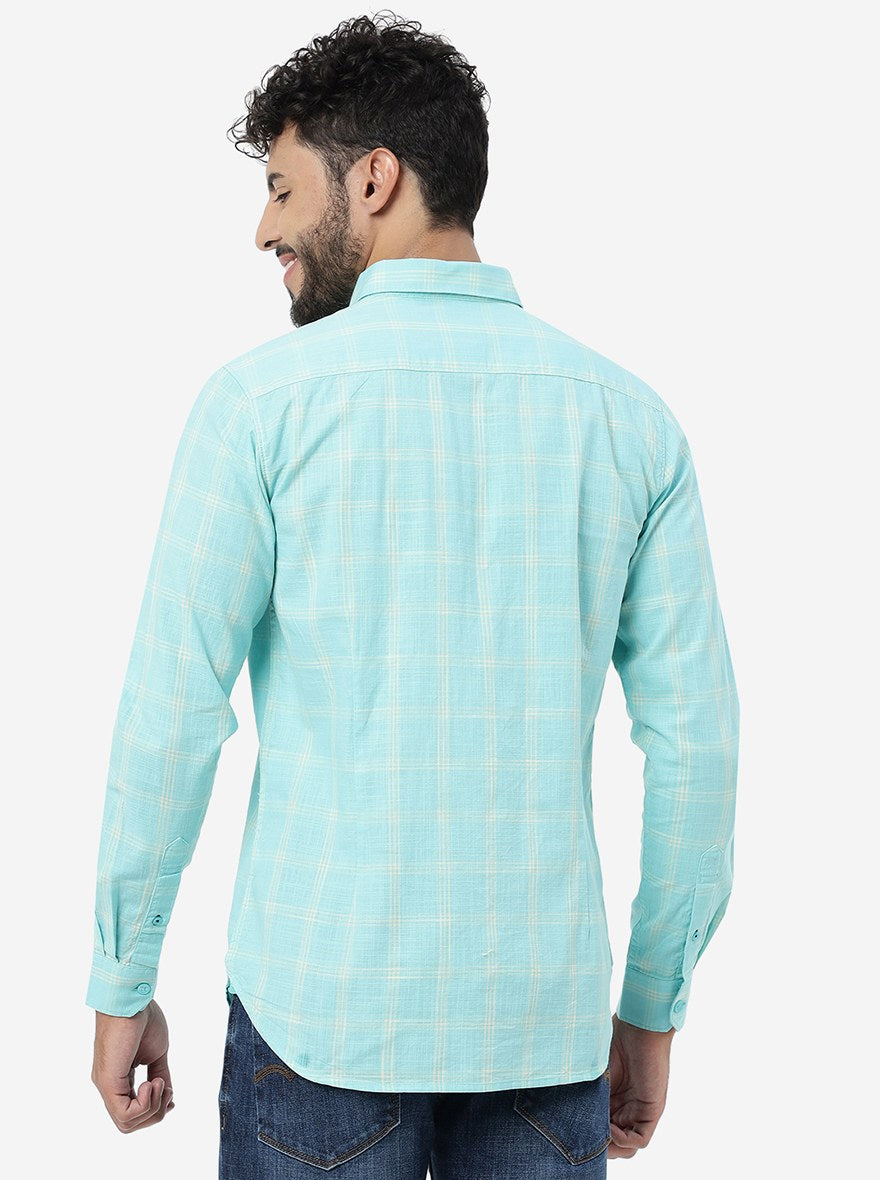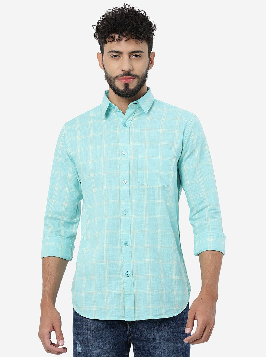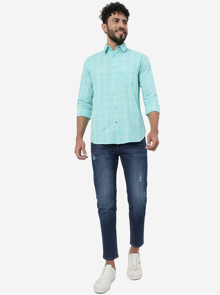 Details: Add new styles to your wardrobe with this Pool Blue 100% Cotton Semi Casual Shirt from JadeBlue. Fabricated with 100% Cotton promises a comfortable and breathable wearing experience. Offers a slim fit for a sleek look that has been elevated with a checked pattern. Features with a chest pocket, Full sleeves, and a regular shirt collar. Match it with the well-fitted trousers of your choice and a pair of oxford shoes and you are ready to go.